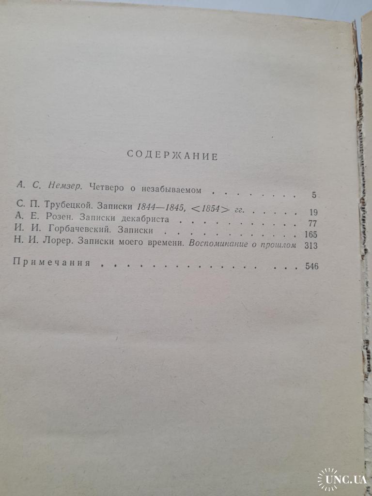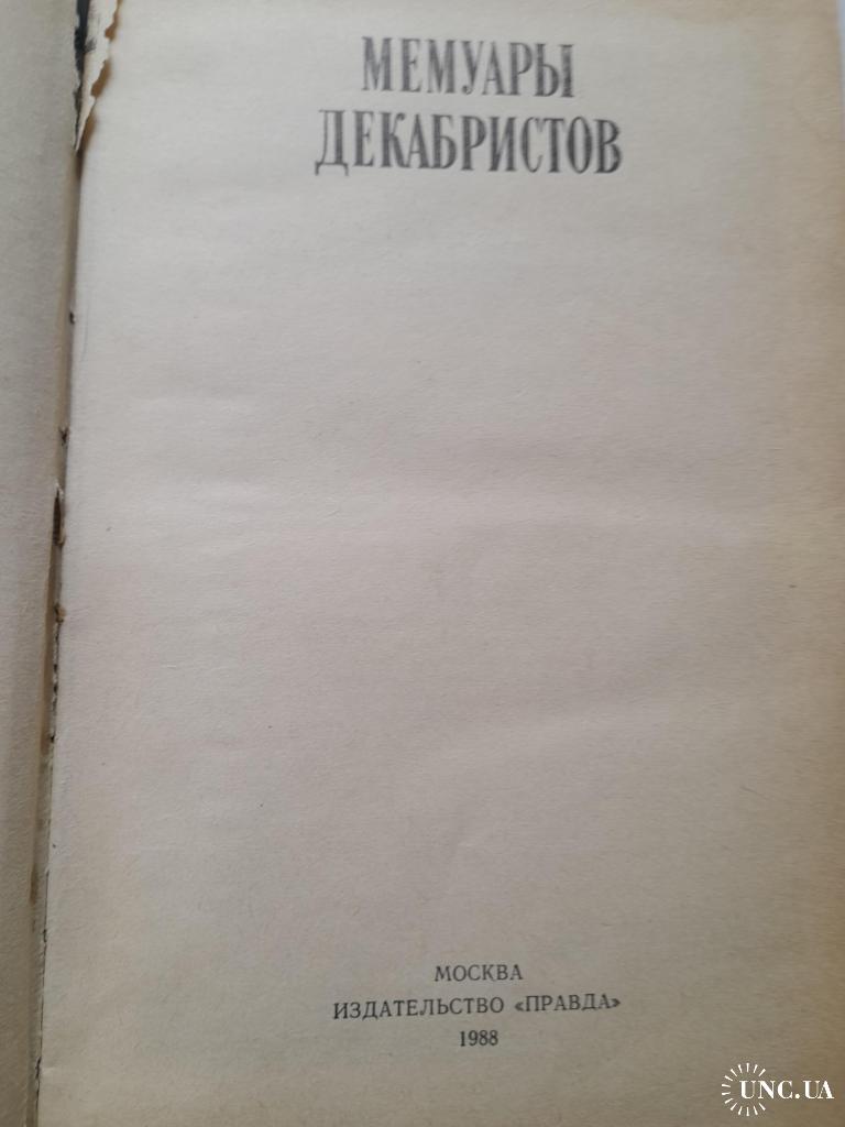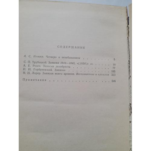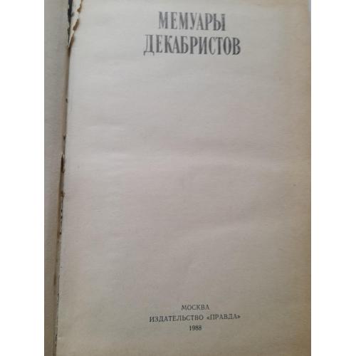 В сборник входят воспоминания декабристов-участников Северного и Южного общества. В мемуарах также освещены события восстания Черниговского полка в Украине,суд и следствие над декабристами,пребывание их в крепости,на каторге и в ссылке. Тведый переплёт титульного листа имеет небольшой дефект.