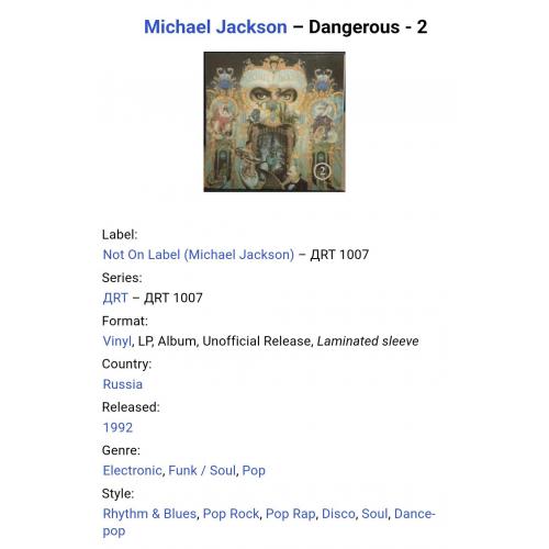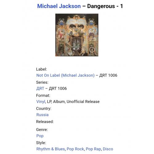 1981-2000Вінілові платівки. Восьмий, в дискографії, студійний альбом, легендарного, Американського короля поп-музики Майкла Джозефа Джексона (Dangerous) 1991. Випущено невідомою фірмою в росії, в1992-му році. Неофіційне видання (Unofficial Release). Видання з двох платівок (2LP). Стан платівок EX+. Стан конвертів ЕХ+. Відправка по Україні службами доставки: Нова Пошта, Укр Пошта, Делівері. Також відправляємо посилки за кордон по цілому світу.