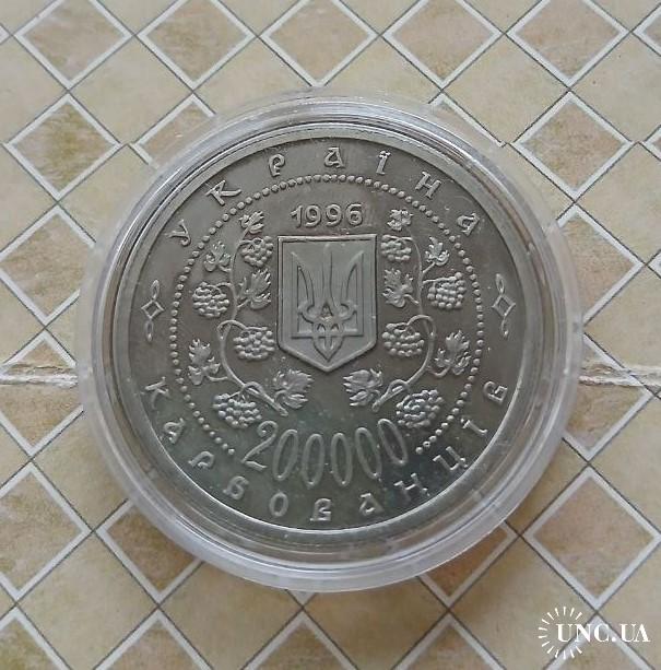 Original9 августа 1996 года монеты с карбованцами вышли в последний раз. Недолгий их период завершал «Михайло Грушевський» номиналом 200 000 карбованцев: мельхиор, вес 14,35 грамма, диаметр 33 мм, пруф-лайк, рифленый гурт, тираж 75 000 штук.