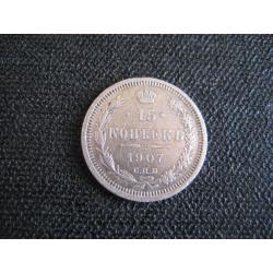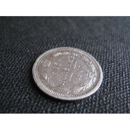 №2567. Металл - серебро 500 пробы. Оригинальная монета - 15 копеек 1907 СПБ ЭБ царская Россия (Николай II). Состояние прошу оценивать по фото. Диаметр-19,5мм. Пересылка по Украине - Новой почтой, Укрпочтой. Для киевлян возможность встречи и просмотра (воскр. метро Нивки). В РФ и Белоруссию не отправляю!