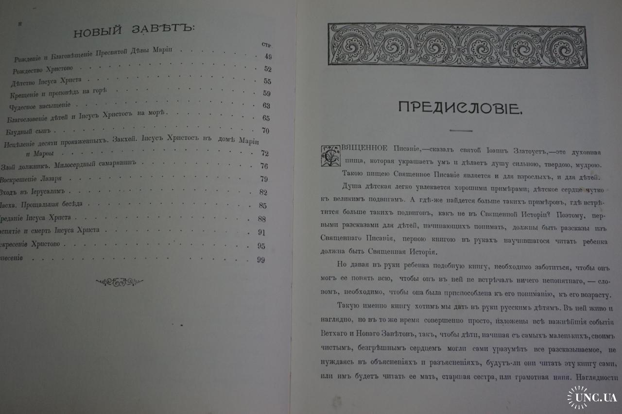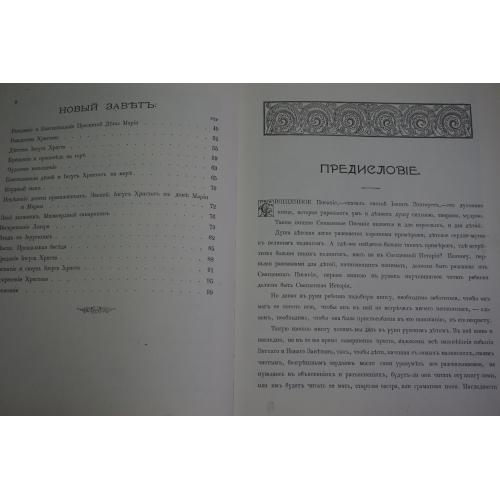 Таку саме книгу хочемо ми дати в руки російським дітям. У ній жваво та наочно, але водночас абсолютно просто, викладені всі найважливіші події Старий і Новій Нового Письмов, так, щоб діти, починаючи з найменших, своїм чистим, 58еним серцем могли самі зрозуміти все щічене, не потребуючи поясненнях і роз'ясненнях, чи вони будуть читати цю книгу самі, чи їм читатиме її мати, старша сестра чи грамотна няня. Наочікуваності у викладі відповідає й наочність нароково підібраних малюнків: доповнюючи розповідь і зображуючи події, що описуються, ці малюнки ще більше роз'яснять і зміцнять у дитячій душі все те, що буде ними прочитано.