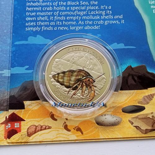Набір із двох пам’ятних монет присвячений унікальним представникам морської фауни Чорного та Азовського морів – невід’ємній складовій природної спадщини України. Чорне та Азовське моря відіграють важливу роль у збереженні біорізноманіття регіону, підтриманні екологічної рівноваги та забезпеченні економічної стабільності держави. Серед багатьох мешканців цих водойм – рак-самітник (Diogenes pugilator) і бичок-кругляк (Neogobius melanostomus) – види, що слугують біоіндикаторами стану морського середовища та є важливими елементами морських екосистем. Цим набором з двох пам’ятних монет Національний банк України має на меті привернути увагу до проблеми збереження морів, нагадати про відповідальність людства за охорону природних ресурсів і підкреслити значення морської біоти у формуванні екосистеми України.