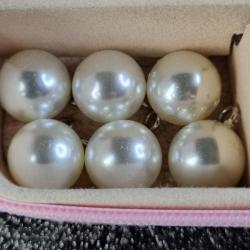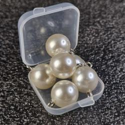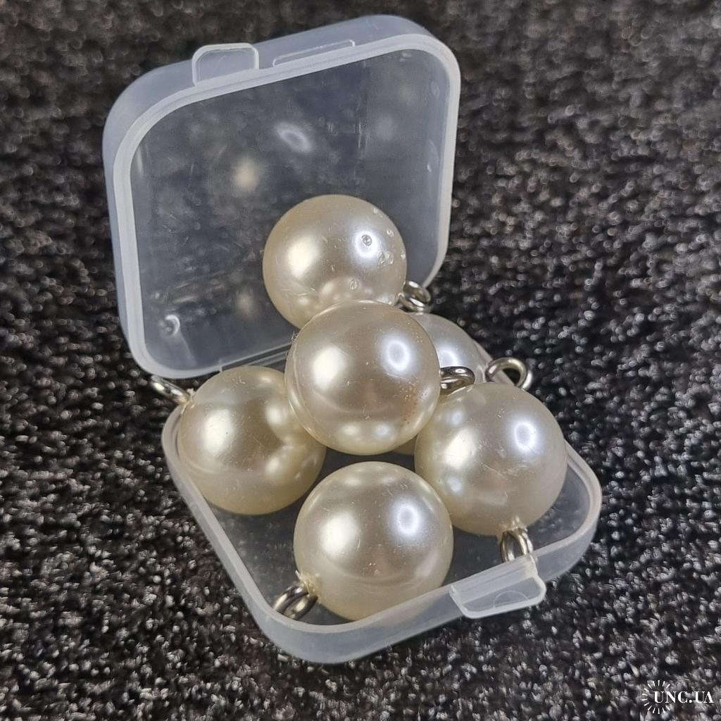 Пропоную набір з 6 великих перлиноподібних підвісок для створення прикрас. Кожна кулька має металеву петельку, що дозволяє легко використовувати її у сережках, браслетах, кольє або інших аксесуарах. Глянцева поверхня, класичний білий колір, діаметр приблизно 1,2 см. Підвіски мають незначні поверхневі сліди, що не впливають на загальний вигляд. Загальна вага — 9,2 г.