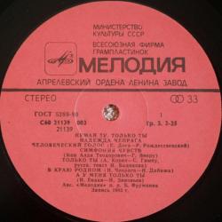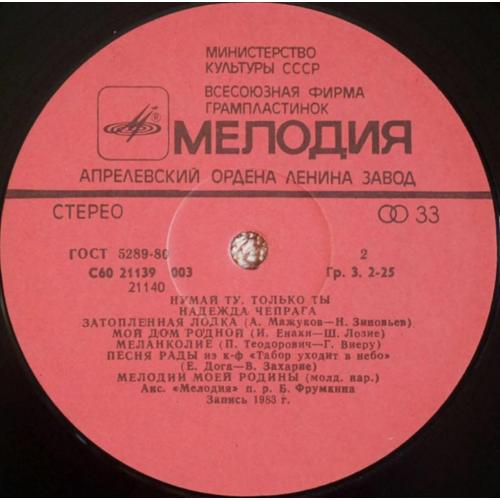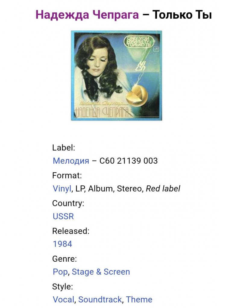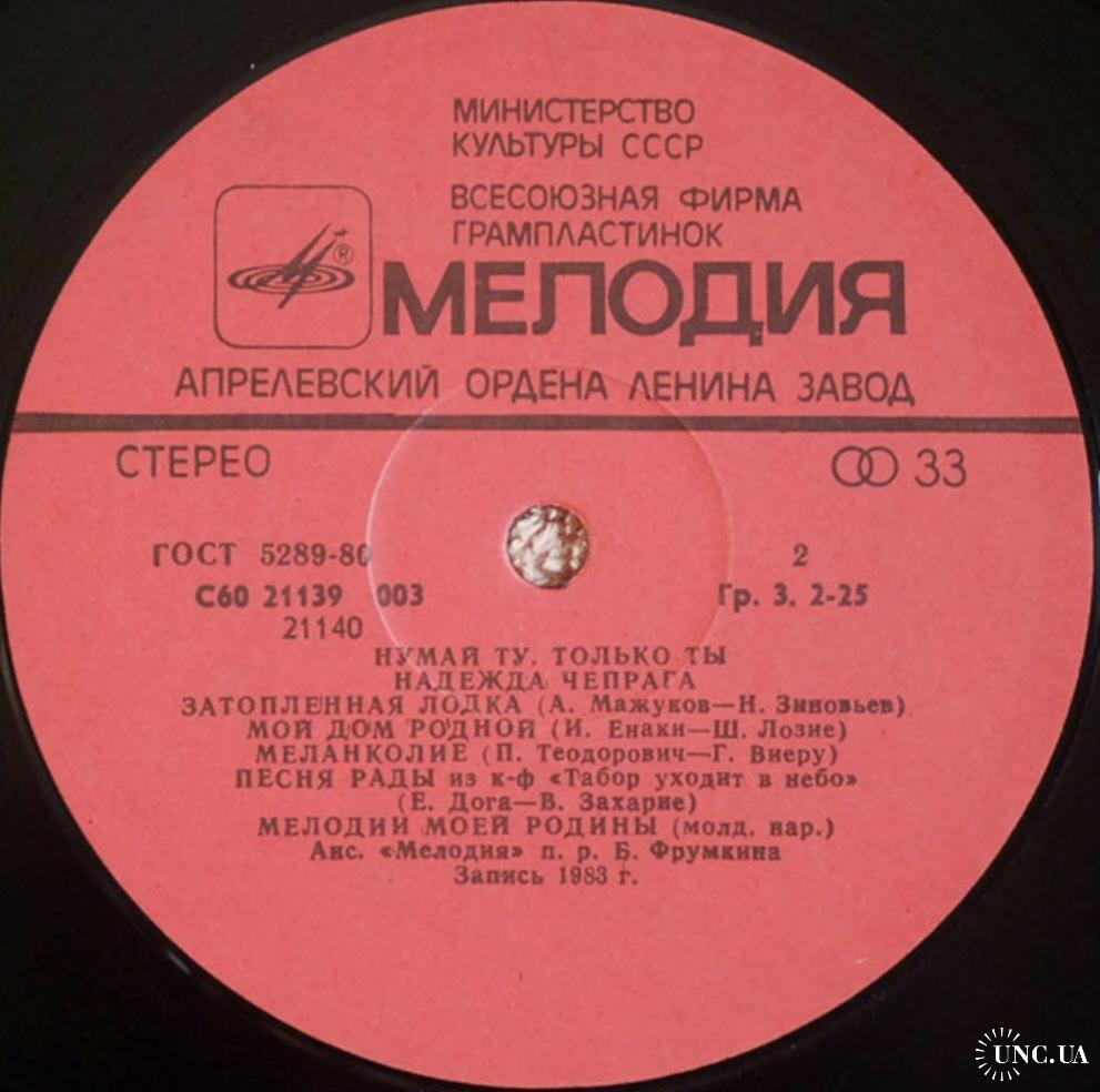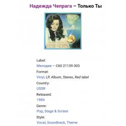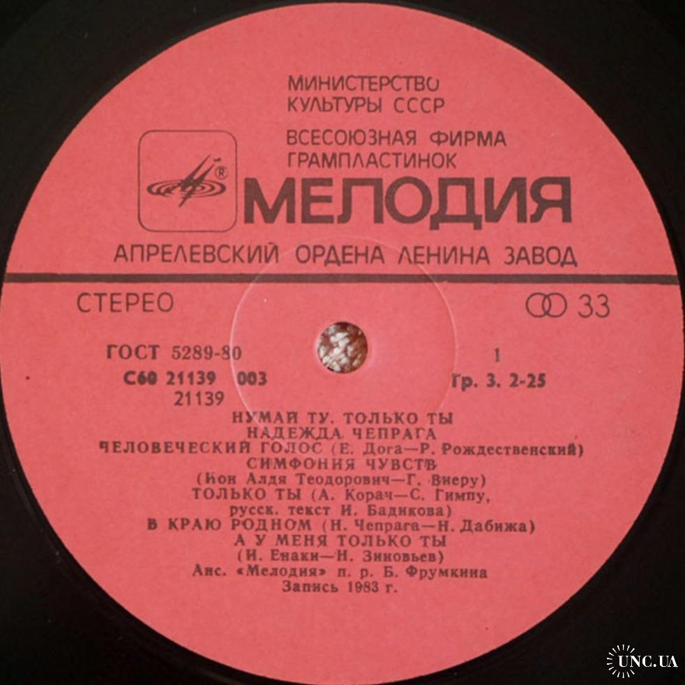 Вінілова платівка. Перший, дебютний, в дискографії, студійний альбом, Молдавської (радянської) естрадної поп-виконавиці, Народної Артистки Молдавської РСР, Надії Чепраги та інструментального ансамблю Мелодія (Только Ты) 1983. Випуск фірми (Мелодія) СРСР, Апрелєвський завод грамплатівок, 1984-ий рік. Стан платівки ЕХ+. Стан конверту ЕХ+. Відправка по Україні службами доставки: Нова Пошта, Укр Пошта, Делівері. Також відправляємо посилки за кордон по цілому світу.