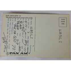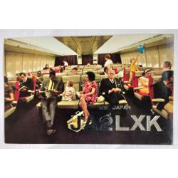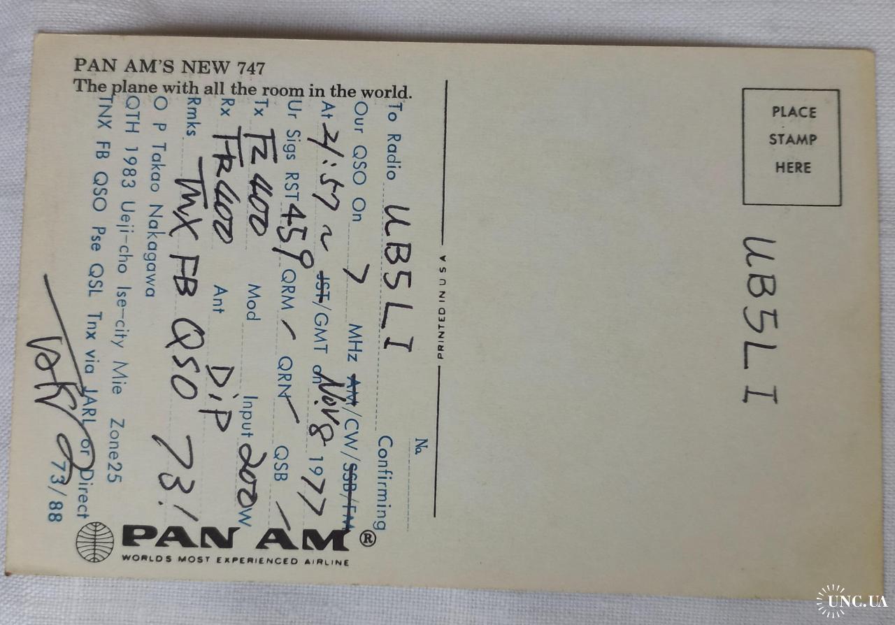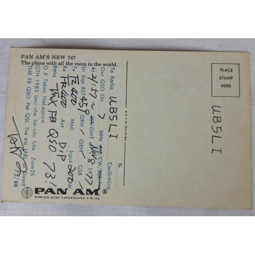 Использован бланк почтовой открытки с изображением салона Боинг-747. Также на лицевой сторонеразмещен позывной сигнал радиолюбителя из Японии, выполненный методом фольгированного тиснения, радиолюбителя из Японии, а также его локация. На обратной стороне – надпись: « Самолет, в котором больше всего места в мире», а также логотип PANAM с подписью под ним: «Самая опытная авиакомпания в мире». Здесь же – данные радиообмена в эфире. Карточка без дефектов. Состояние отличное.