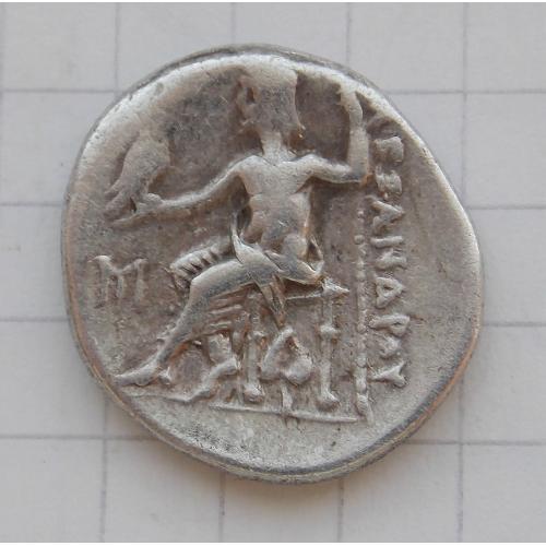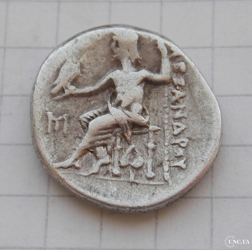 Реверс: AΛEΞANΔPOY.Зевс сидить ліворуч, тримає орла та скіпетр; у лівому полі, монограма; під троном, лист плюща..