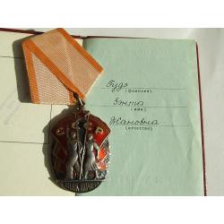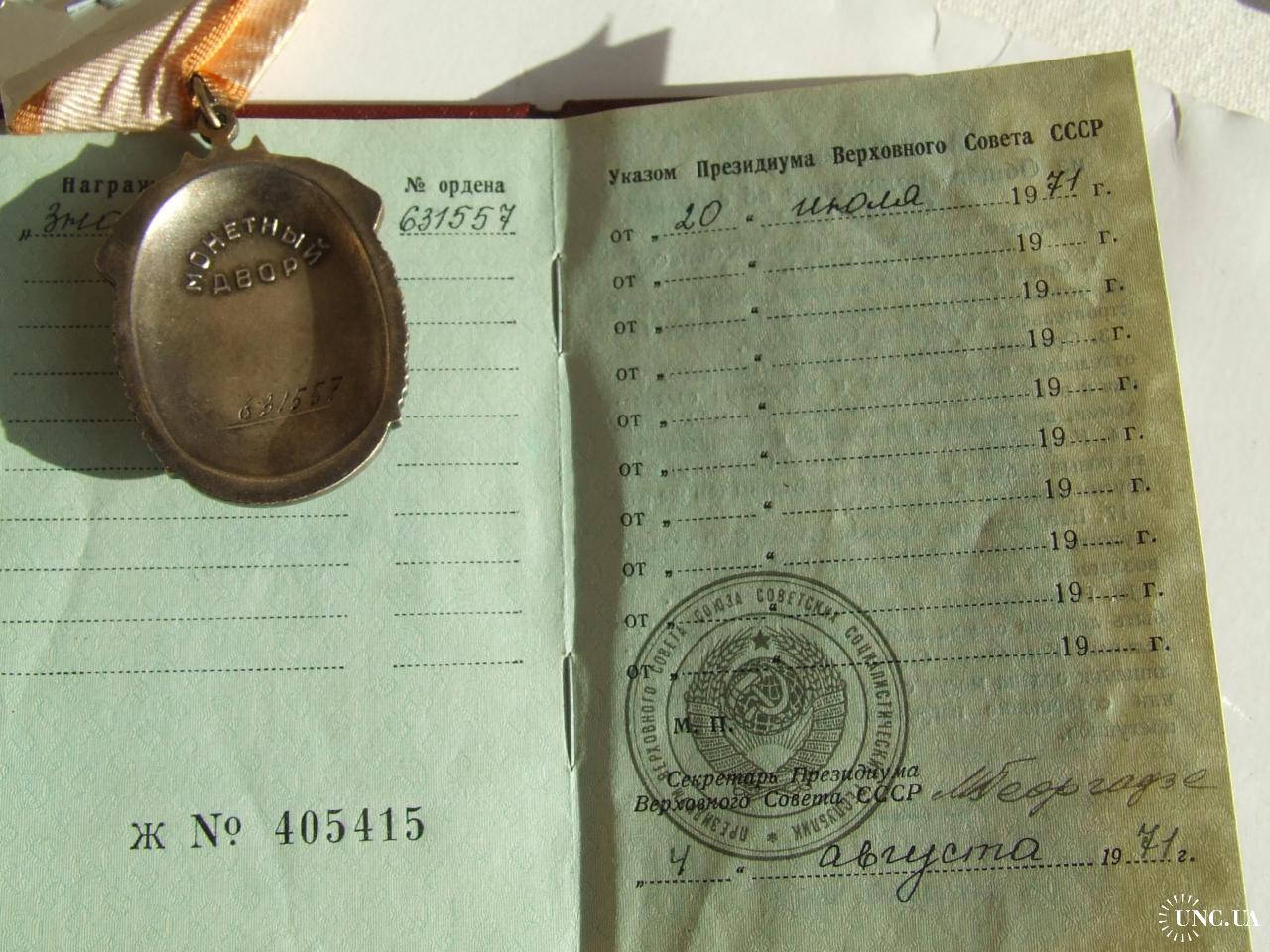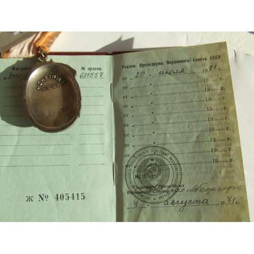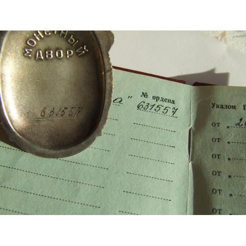 Орден Знак почета № 631 557 + доки нагр. 1971 года на Гуде Зента . Люкс. В родной патине.
