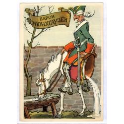 Открытка Барон Мюнхаузен Художник К. Ротов 1958 ИЗОГИЗ Лошадь Сабля Мундир
