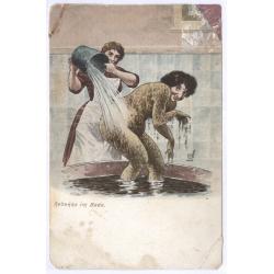 Еврейка, с другой стороны, как и еврей на других изображениях этого жанра, изображена толстой, кривой и хитро ухмыляющейся.