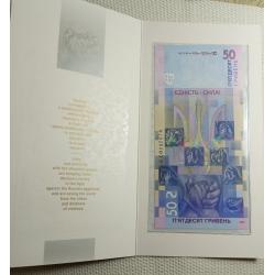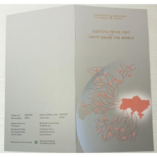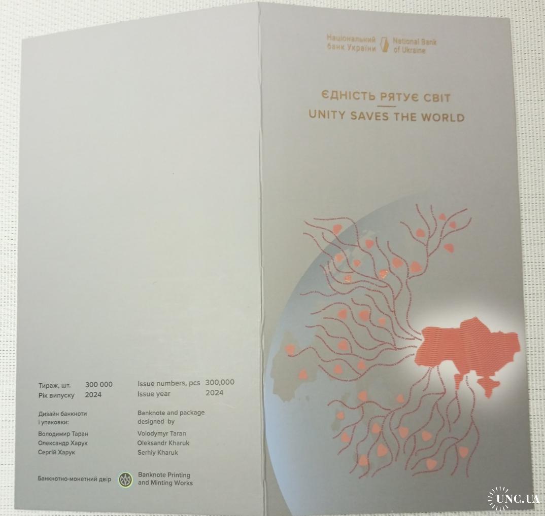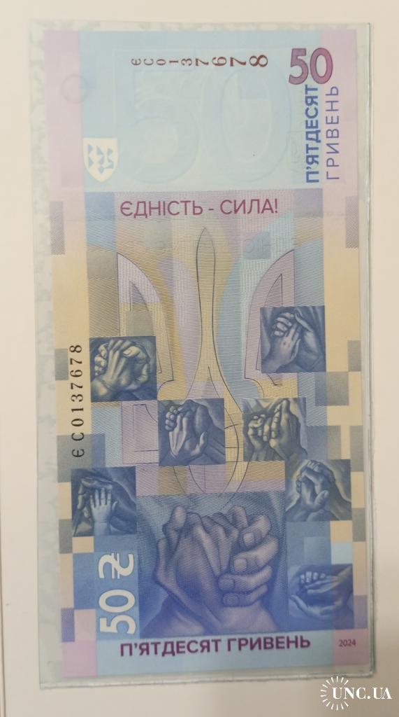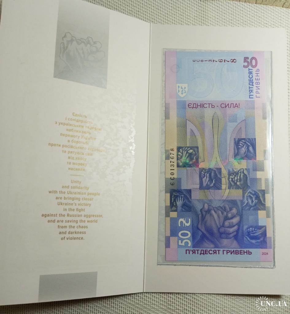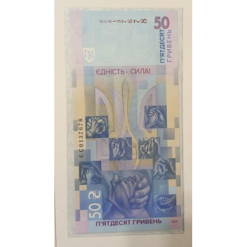availableПам'ятна банкнота НБУ номіналом 50 гривень "Єдність рятує світ" у сувенірному пакуванні, тираж – 300 000 шт., за підписом Голови НБУ - Андрія Пишного. Номер банкноти ЄС 0137678