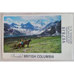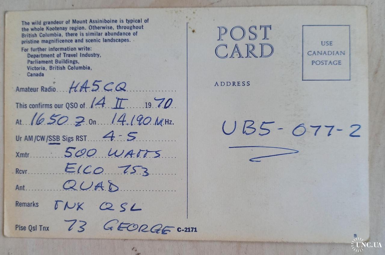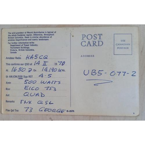 Заполнена, как радиолюбительская QSL-карточка. На лицевой стороне: видовое фото. Также здесь имеется штамп позывного сигнала канадского радиолюбителя и его почтовый адрес. На обратной стороне помещен текст видовой открытки: «Дикое величие горы Ассинибойн типично для всего региона Кутеней. Впрочем, по всей Британской Колумбии можно увидеть такое же изобилие первозданной красоты и живописных ландшафтов». Также приведены данные радиообмена в эфире. Карточка практически без изъянов. Состояние хорошее.