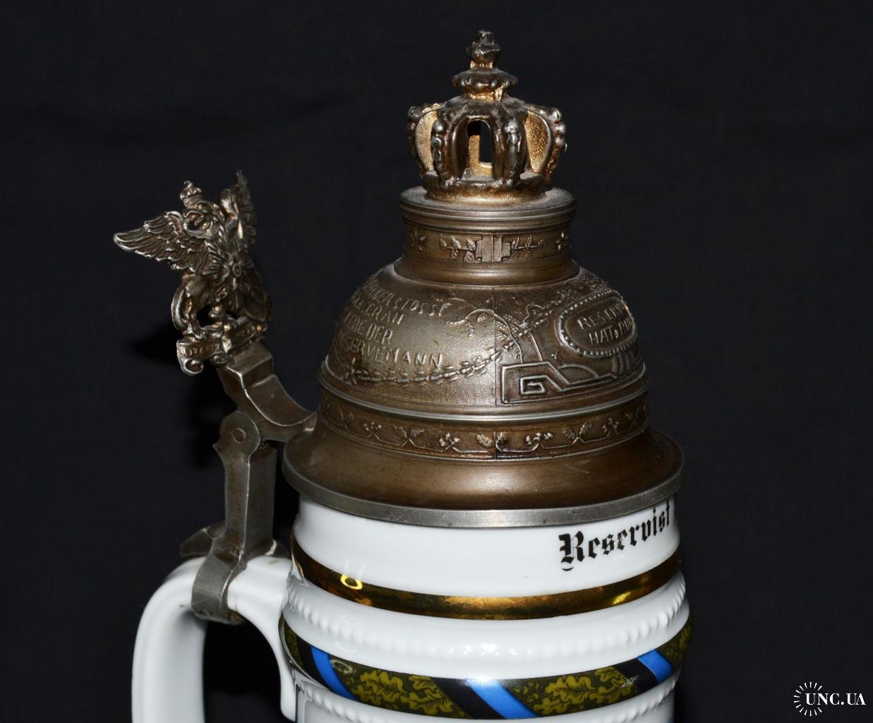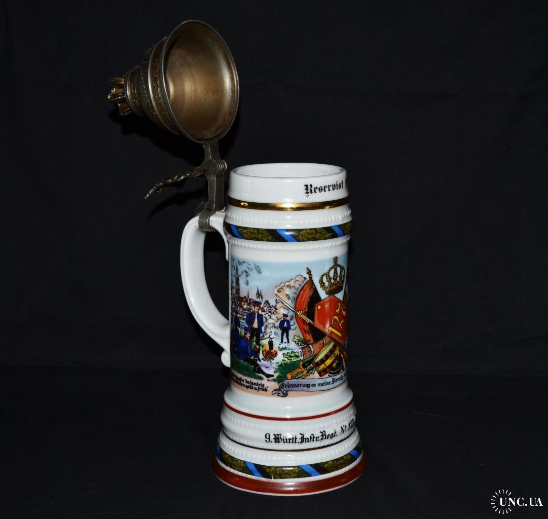Это реплика полковой кружки, которая изготавливалась во времена первой мировой войны. На кружке отображён сюжет военных действий и жизнь солдат.