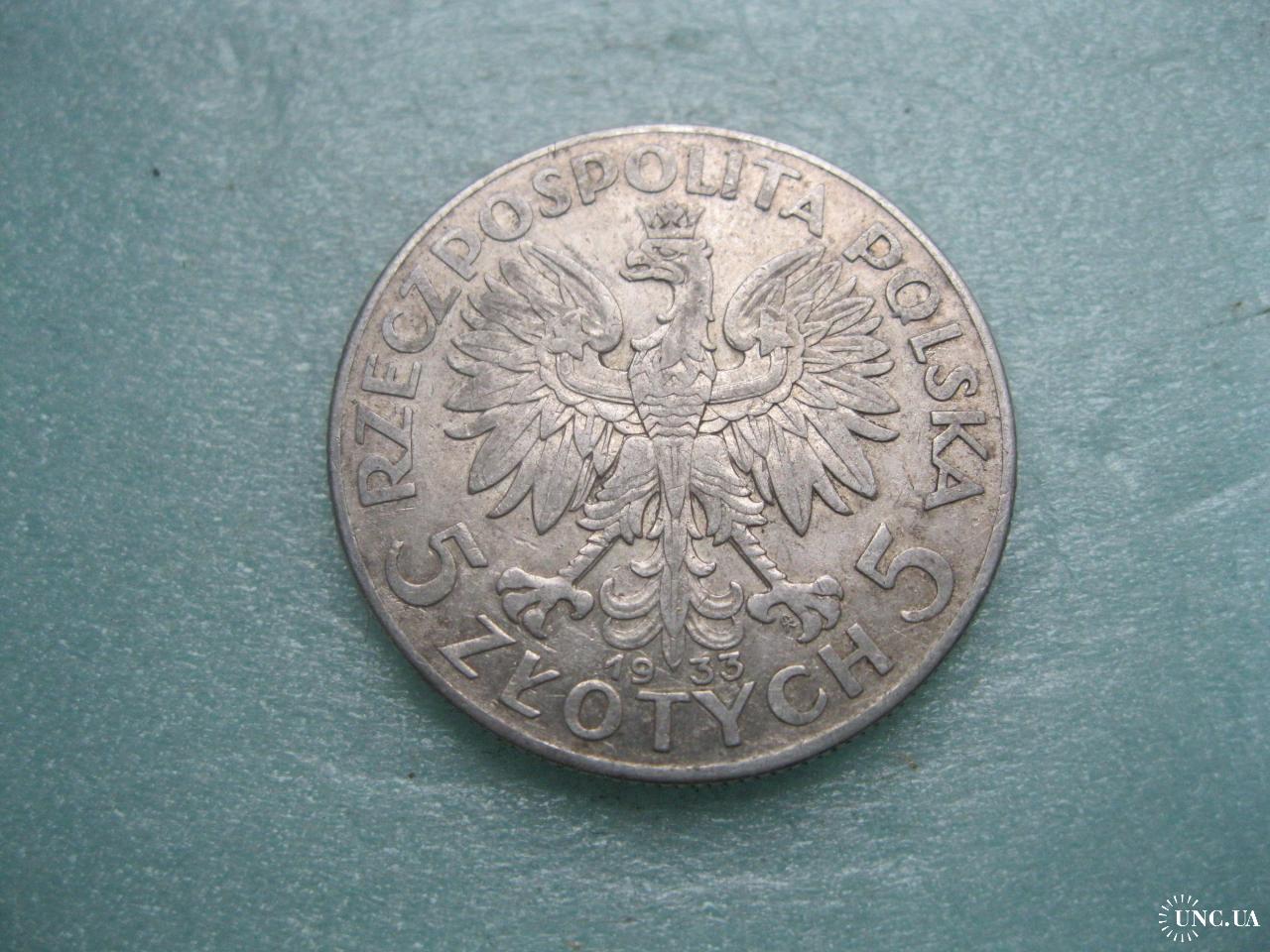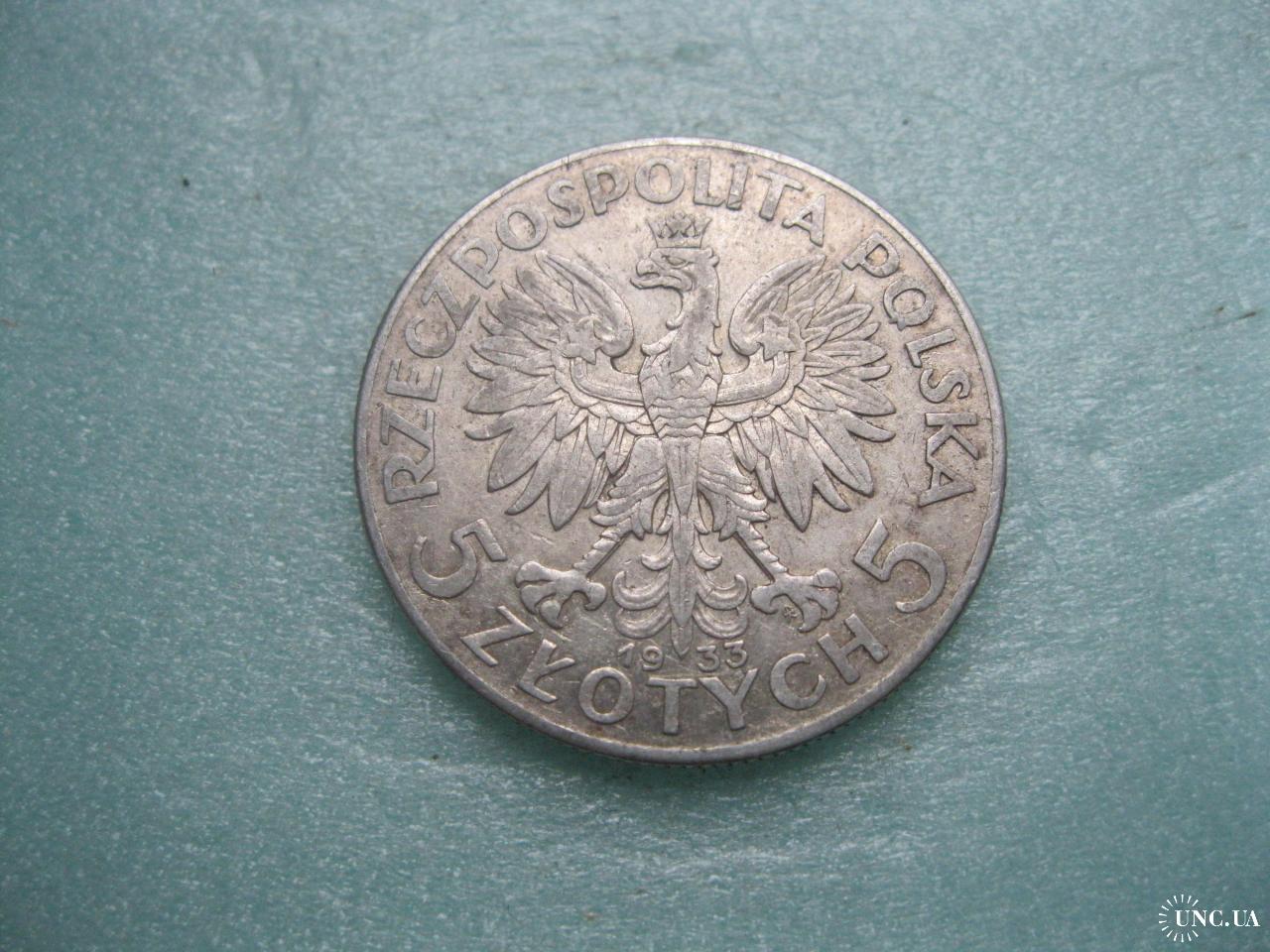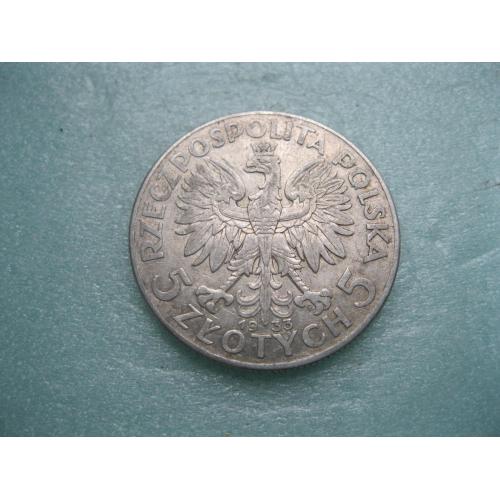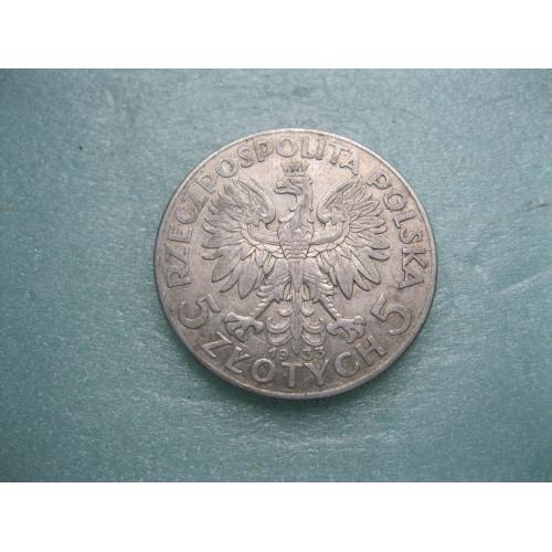 OriginalПольша 5 злотых 1933 г. "Голова полонии" . Сохран .Серебро 750 проба. Оригинал. Состояние по фото
