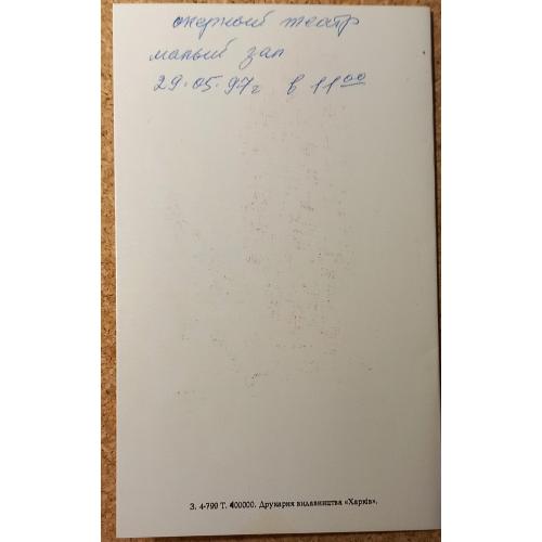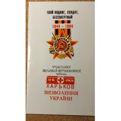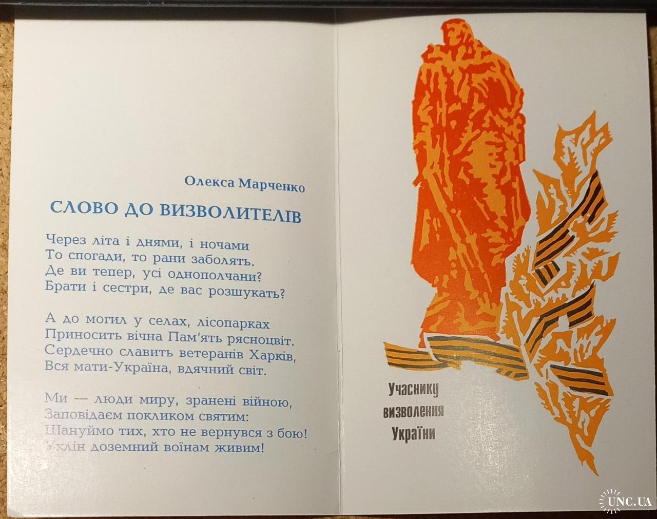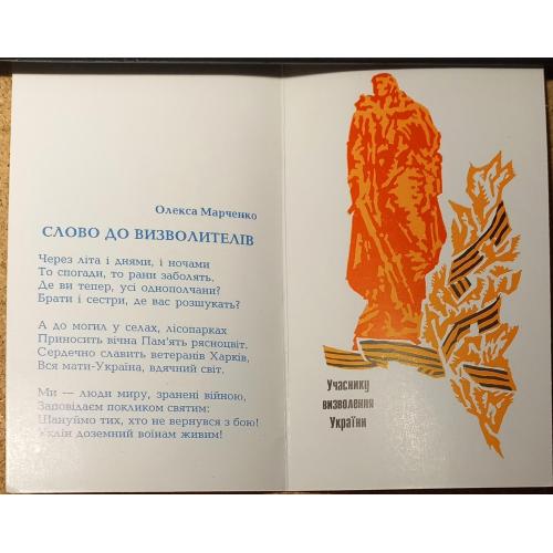 Областной комитет Общества красного креста (ОК ОКК). На развороте слева: Стихотворное обращение к освободителям Харькова. Автор Олекса Марченко- известный харьковский поэт, лауреат премии им. Александра Олеся. Справа – стилизованное изображение памятника Воину-освободителю в Берлине и подпись «Участнику освобождения Украины». На последней странице место и дата встречи с участниками ВОВ и типографские данные: Типография изд-ва «Харьков»,т. 400 000. Открытка без дефектов. Состояние отличное.