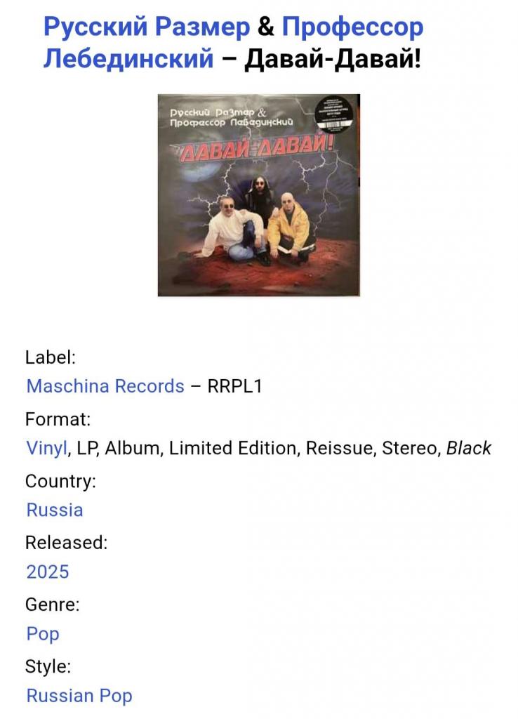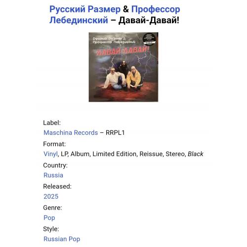 Вінілова платівка. Перший, дебютний, в дискографії, студійний альбом, російського техно, поп виконавця Олексія Лебединського, більше відомого під сценічним ім'ям Профессор Лебединский і групи Русский Размер, до складу якої, на той час, входили Дмитро Копотілов, Сергій Черних, Олексій Левін, Віктор Бондарюк, Анжела Кузнєцова, Олександр Тюрін та Дмитро Хіль (Давай-Давай!) 1996. Випуск фірми (Maschina Records) Estonia, 2025-ий рік. Вперше на вінілі. Лімітований тираж (Limited Edition). Видання нове, запаковане. Категорія S/S. Відправка по Україні службами доставки: Нова Пошта, Укр Пошта, Делівері. Також відправляємо посилки за кордон по цілому світу.