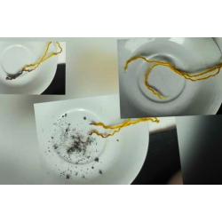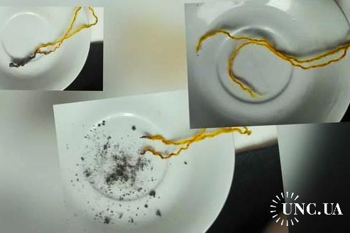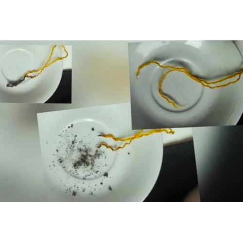 Горит ярко с характерный запахом, после сгорания остаток растирается в пепел, см. фото
