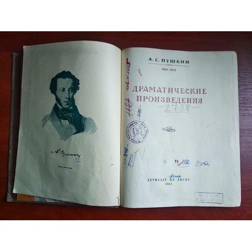 пушкин, драматические произведения, 1937, 242 стр с иллюстр, тираж 20 тыс, одесса, издательство оддоблит, твердая обложка, удовлетворительное состояние.