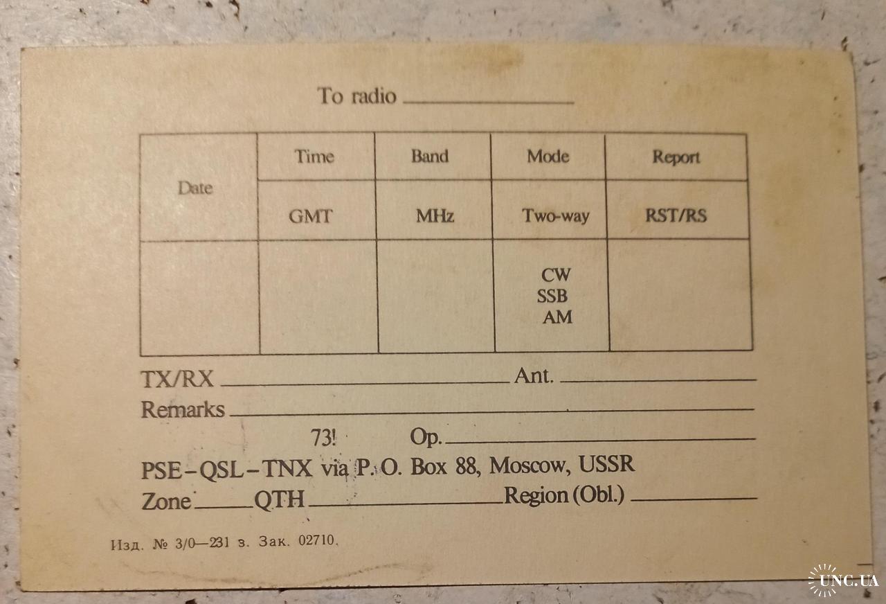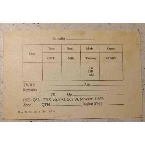 Типовой радиолюбительский бланк СССР. На лицевой стороне в правом углу изображены эмблемы Центрального радиоклуба СССР (Москва) и Федерации радиоспорта СССР (Москва). Также здесь имеется штамп коллективной любительской радиостанции г. Иркутска (цифра 0 здесь перечеркнута, чтобы не спутать с буквой О. Это общее правило для всего мира). Такие типовые бланки использовались всеми радиолюбителями СССР, независимо от их местонахождения. Обратная сторона предназначена для заполнения данными радиообмена в эфире. В данной карточке эти данные не заполнены. Карточка без дефектов. Состояние отличное.