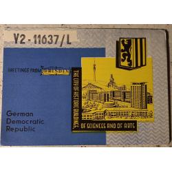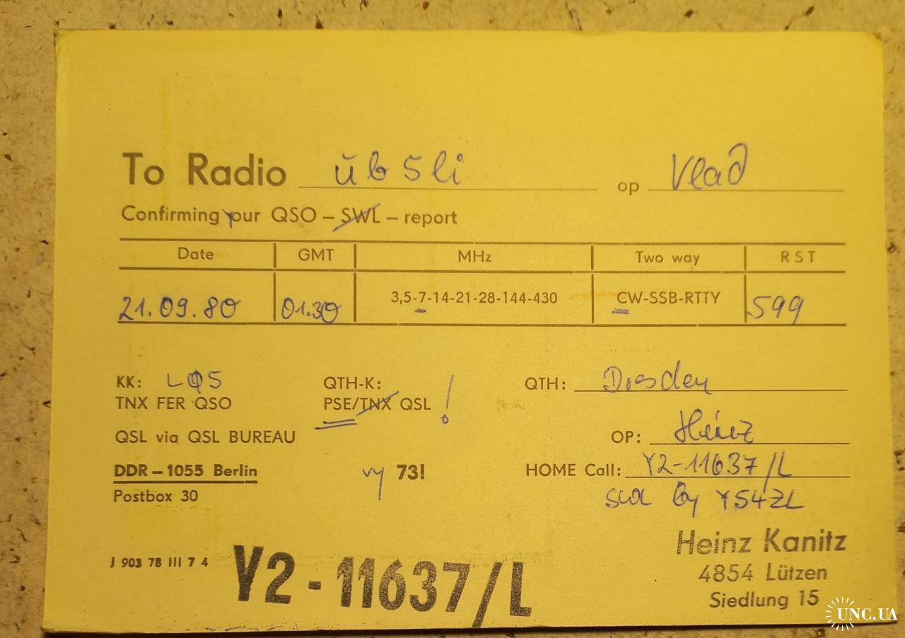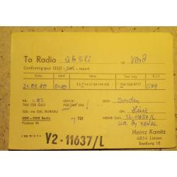 Типовой бланк радиолюбительской карточки-квитанции. На лицевой стороне нарисован фрагмент города с надписью: «Город исторических зданий, науки и искусства», а также его геральдика. На обратной стороне заполненная таблица с данными радиообмена в эфире. В данном случае карточка заполнена радионаблюдателем (он только слушает эфир, без выхода на передачу) из города Лютцен. Его штамп с позывным имеется и на лицевой и на обратной стороне карточки. В карточке незначительно примяты уголки. Состояние хорошее.