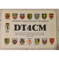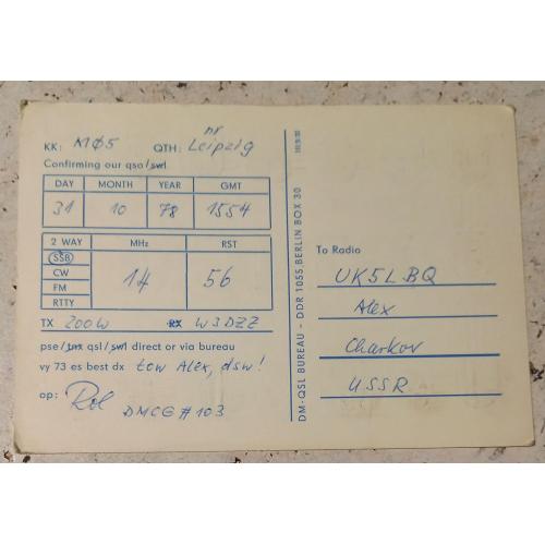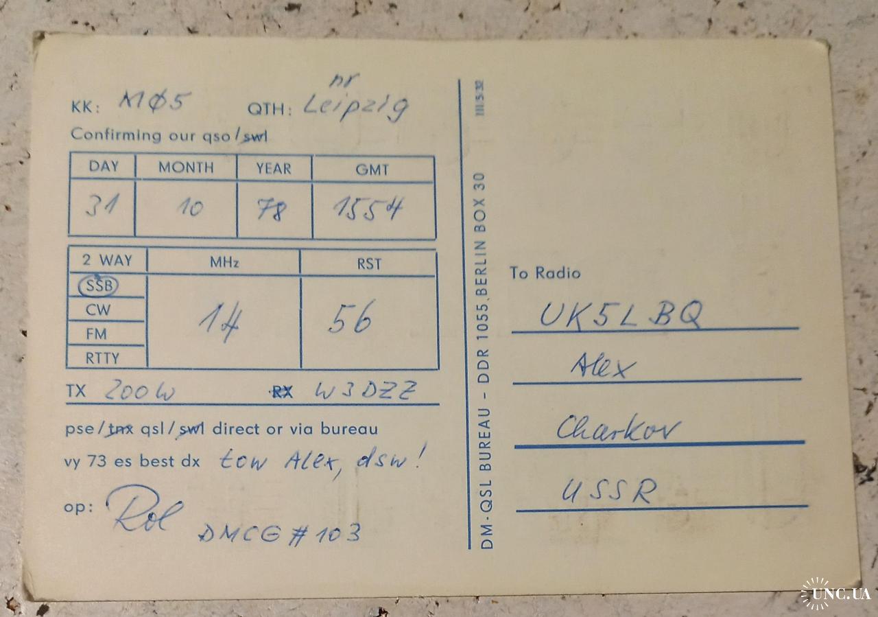 1961-1980Округ – это была административная единица в ГДР. Восточный Берлин с 1961 года имел статус округа.На лицевой стороне размещен специальный позывной-сигнал по случаю 25-летия радиолюбительского спорта в ГДР. На обратной стороне – данные радиообмена в эфире. Едва заметная помятость уголков. Состояние карточки хорошее.