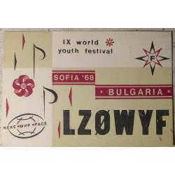 IX Всемирный фестиваль молодёжи и студентов — фестиваль, который проходил с 28 июля по 6 августа 1968 года в столице БолгарииСофии. Мероприятие состоялось под лозунгом «За солидарность, мир и дружбу» и собрало более 20 000 участников из 138 стран. Фестиваль планировался в период роста антивоенного и студенческого движения в капиталистических странах, расцвета движения хиппи и, одновременно, в разгар холодной войны. На лицевой стороне слева изображен стилизованный логотип Всемирного фестиваля молодежи и студентов и Земной шар .где слово «Мир» написано на болгарском, русском и английском языках. Крупным шрифтом напечатан позывной-сигнал мемориальной болгарской радиолюбительской станции из Софии. Эта карточка памятна еще и тем, что была подарена мне болгарином- радиолюбителем, приехавшим в Харьков и поступившим в том году в Харьковский государственный университет. и ставшим постоянным оператором на коллективной радиостанции Харьковского дворца пионеров. Его звали Веселин Ценов (нам он запомнился, как Веса). Сейчас ему уже под 80. Связь с ним утеряна. В те времена мы были с ним ведущими операторами на этой станции, так как лучше всех владели морзянкой и даже обучали этому молодых ребят. На обратной стороне типовые графы для заполнения данных радиообмена. Карточка без дефектов. Состояние отличное.