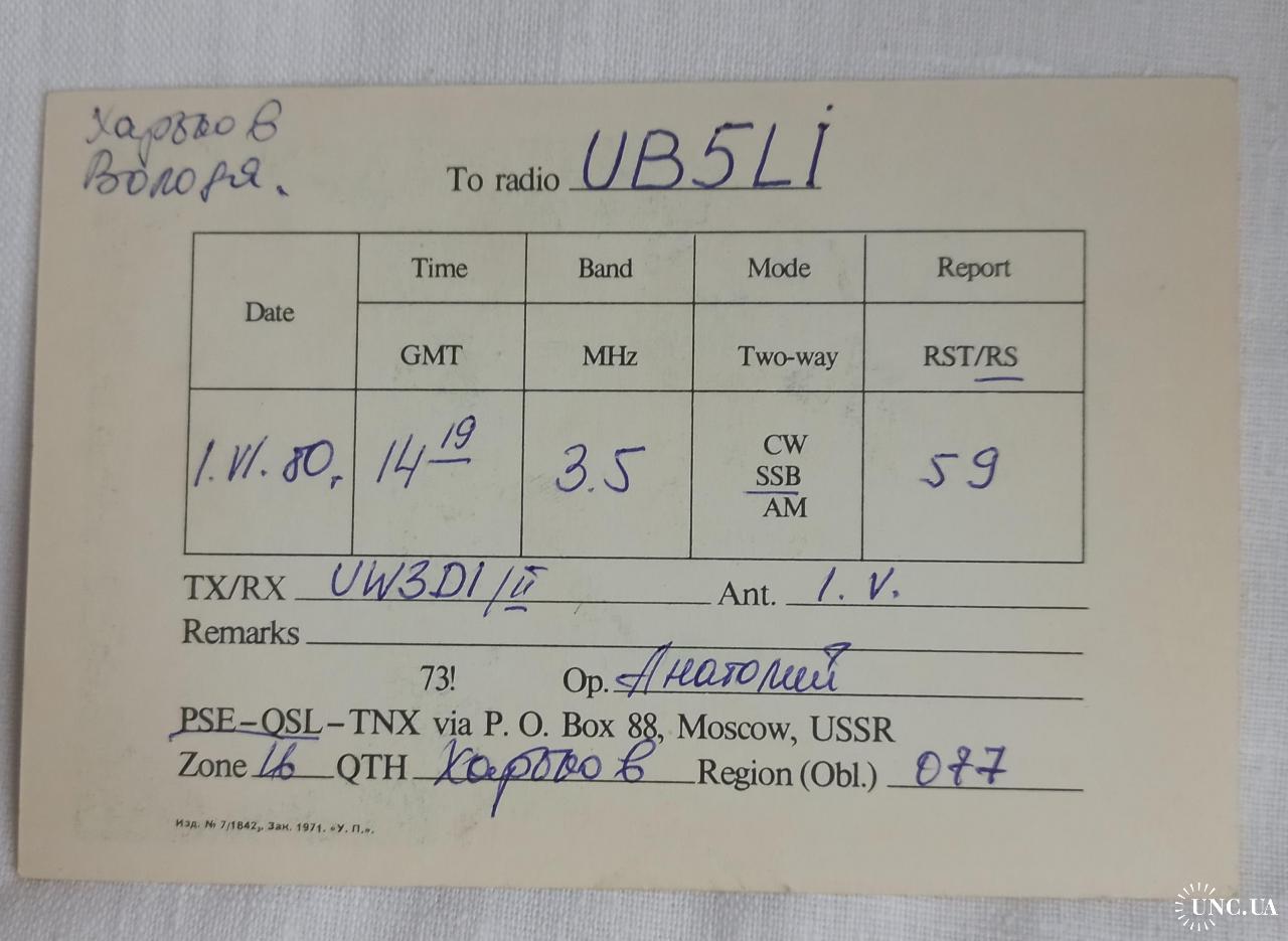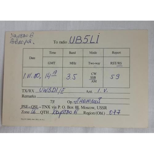 1961-1980Типовой бланк, используемый всеми радиолюбителями СССР. На лицевой стороне стоит штамп позывного сигнала радиолюбителя. На обратной – данные радиообмена в эфире. Оператор из Харькова. Без дефектов. Состояние отличное.