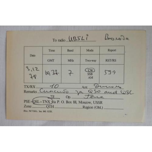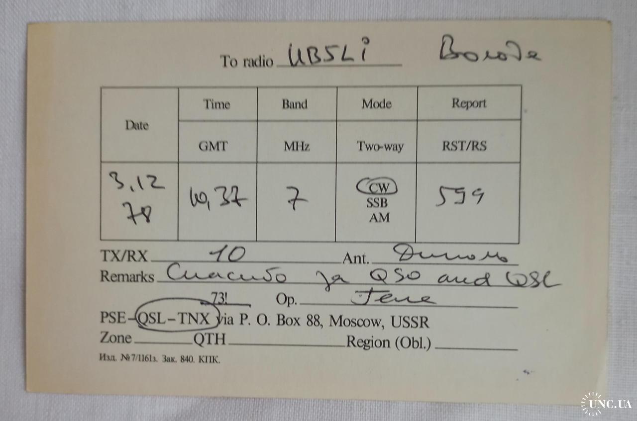 1961-1980На лицевой стороне стоит штамп позывного сигнала радиолюбителя. На обратной – данные радиообмена в эфире. Оператор изХарькова. Без дефектов. Состояние отличное.