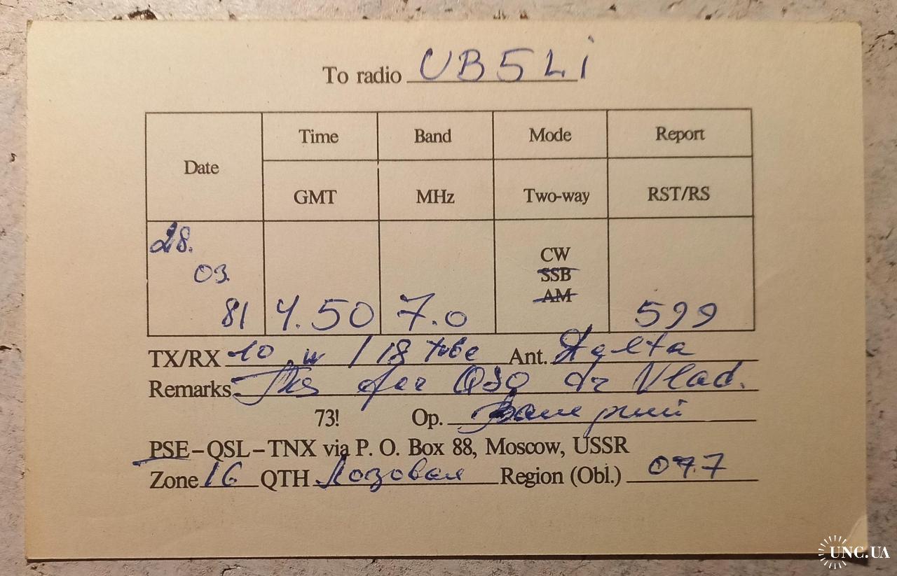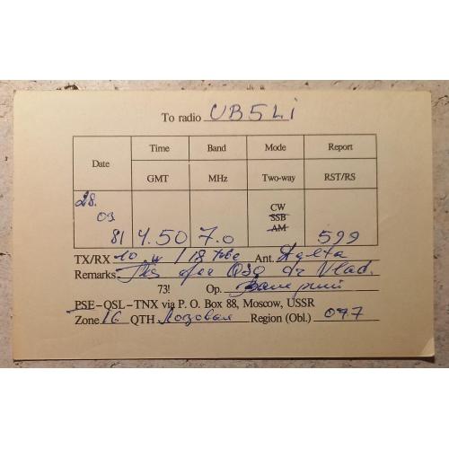 1961-1980На лицевой стороне имеется эмблема Олимпиаы-80 и позывной сигнал радиолюбителя из Лозовой. Бланк карточки типовой. Поэтому его мог использовать для заполнения любой радиолюбитель из СССР. На обратной стороне –данные радиообмена в эфире. Карточка без дефектов. Состояние отличное.