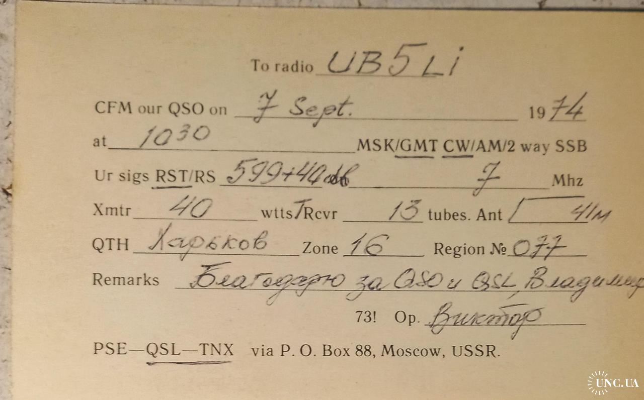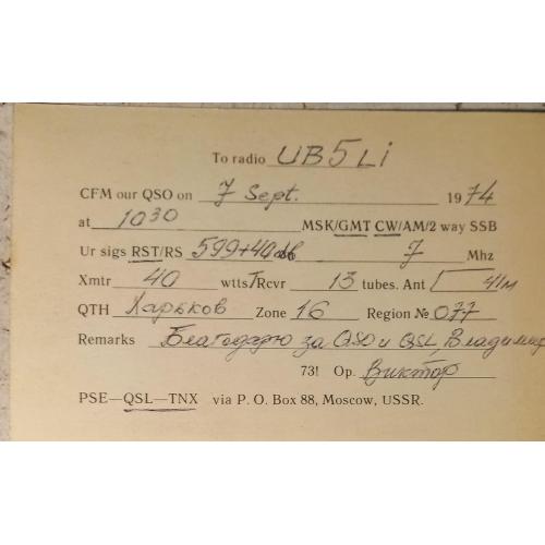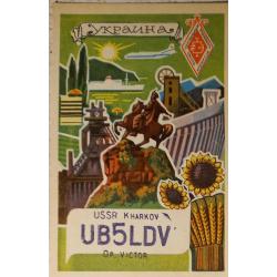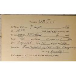 Типовая карточка Центрального радиоклуба СССР. Распространялась по всем радиоклубам ДОСААФ и стоила 1 коп./шт для желающих их приобрести. Это не исключало изготовление авторских карточек типографским способом. На лицевой стороне имеется место для штампа позывного-сигнала в обрамлении картинок с украинской тематикой. На обратной стороне приведены заполненные графы с данными радиообмена в эфире. Данный бланк заполнен радиолюбителем из Харькова. Карточка без дефектов. Состояние отличное.