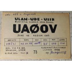 Односторонняя печатная открыткас позывным – сигналом и данными радиообмена в эфире. Цифра 0 (ноль) по общепринятойв радиолюбительской среде договоренности перечеркнута косой чертой (чтобы не было путаницы с буквой О). Еще один технический момент: между Харьковом ( это моя станция UB5LI) и Улан-Удэ более 6 тыс. км. Обычно при длине радиоволны, на которой проходила радиосвязь (коротко «диапазон») – 80 м (или 3,5 MHz0 дальность радиосвязей не превышает 1000 км. В ночное время. как в нашем случае (00.07 по Гринвичу, или 03.07 по Москве), эти расстояния могут быть несколько больше (это зависит от метеоусловий, от солнечной активности, качества связной техники, в т.ч. и антенного хозяйства и пр.). Поэтомудальность этой радиосвязи можно считать определенным достижением. Что касается города Улан-Удэ, то это столица Бурятской АССР (Автономной Советской Социалистической Республики), существовавшей с 1923 года по 1991 год — с 1958 под названием Бурятская АССР, с 8 октября 1990 года как Бурятская Советская Социалистическая Республика. С 27 марта 1992 года — республика Бурятия в составе России. Улан-Удэ известен как уникальный центр буддизма в России, город с богатой историей и место встречи европейской и азиатской культур. Его главные символы — самая большая в мире голова Ленина на площади Советов, близость к Байкалу и историческая купеческая архитектура.Карточка без дефектов. Состояние отличное.