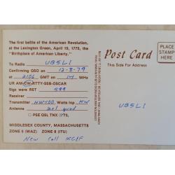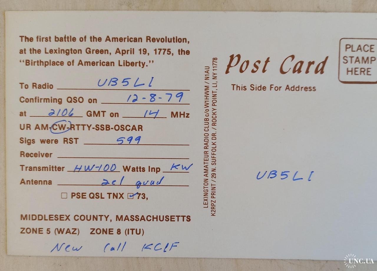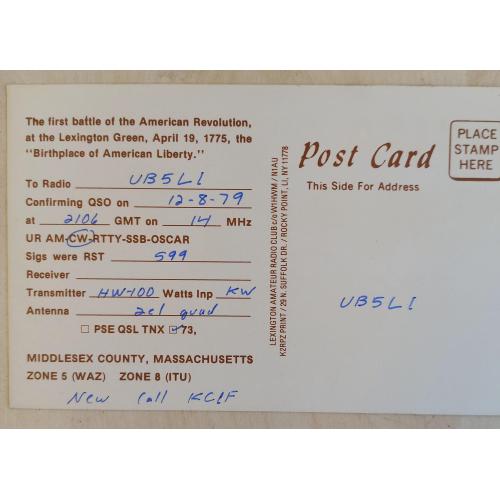 Почтовая карточка заполнена в виде QSL. На лицевой стороне на фоне батальной сцены размещен позывной- сигнал радиолюбителя и его адрес. На обратной стороне – текст: «Первая битва Американской революции на Лексингтон-Грин, 19 апреля 1775 года, место рождения американской свободы.» и данные радиообмена в эфире.