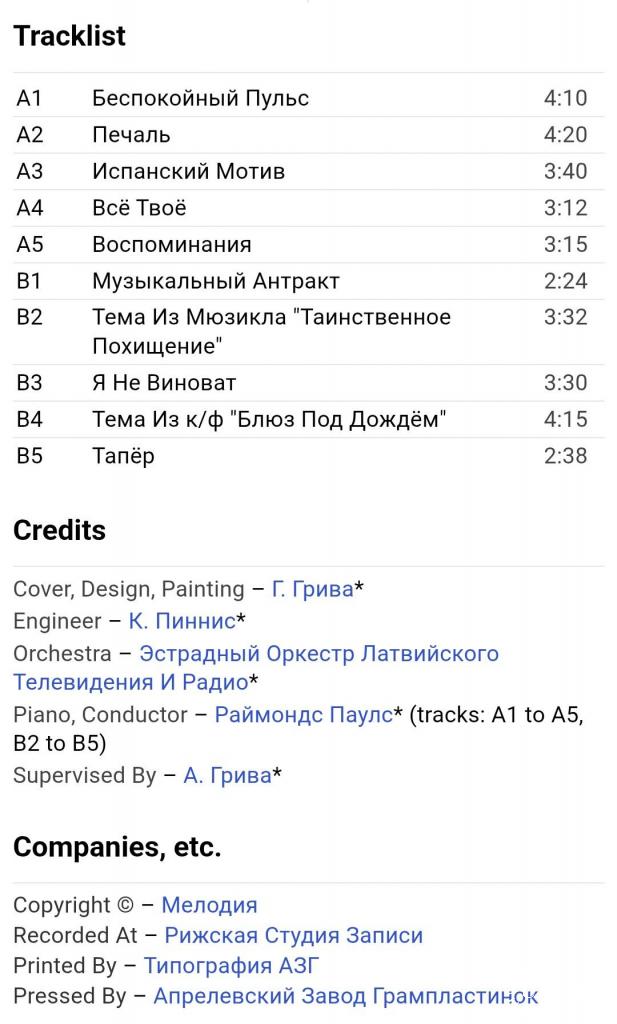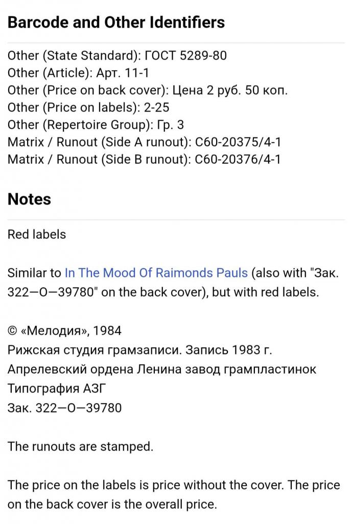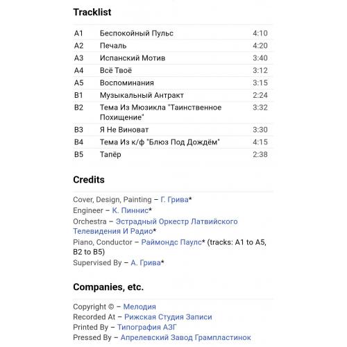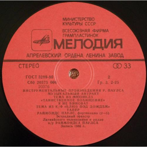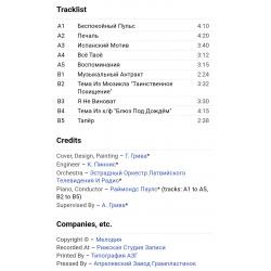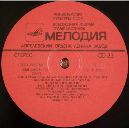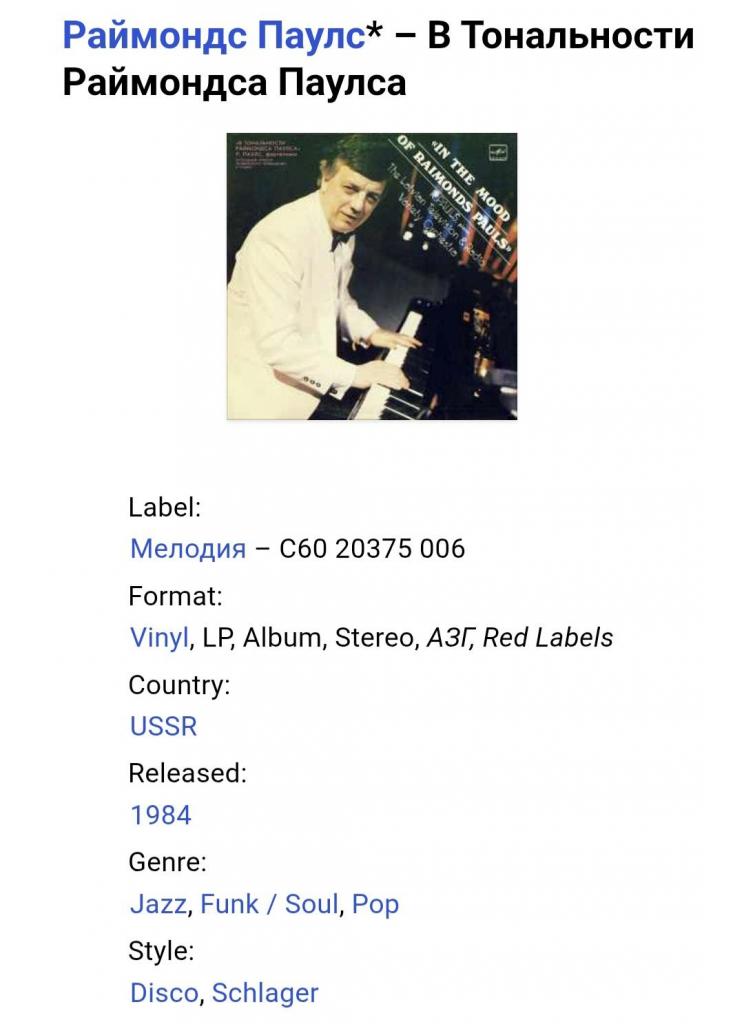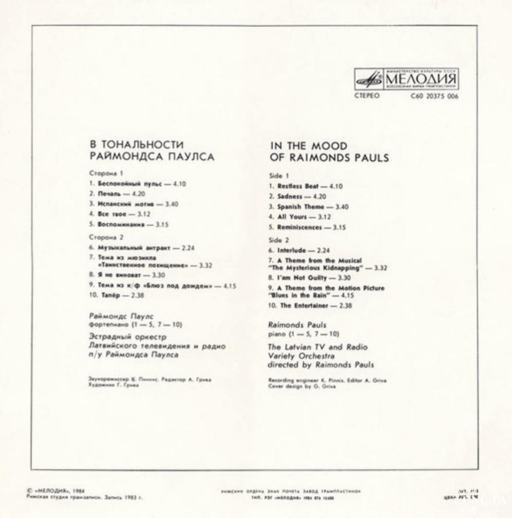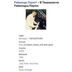 Вінілова платівка. Студійний альбом, Латиського (радянського) композитора і піаніста, стилю джаз-фанк, поп, соул, блюз, Раймондса Паулса (В Тональности Раймондса Паулса) 1983. Випуск фірми (Мелодія) СРСР, Апрелєвський завод грамплатівок, 1984-ий рік. Платівка нова, неіграна, під голкою не була. Категорія М (Mint). Стан конверту NM-. Відправка по Україні службами доставки: Нова Пошта, Укр Пошта, Делівері. Також відправляємо посилки за кордон по цілому світу.