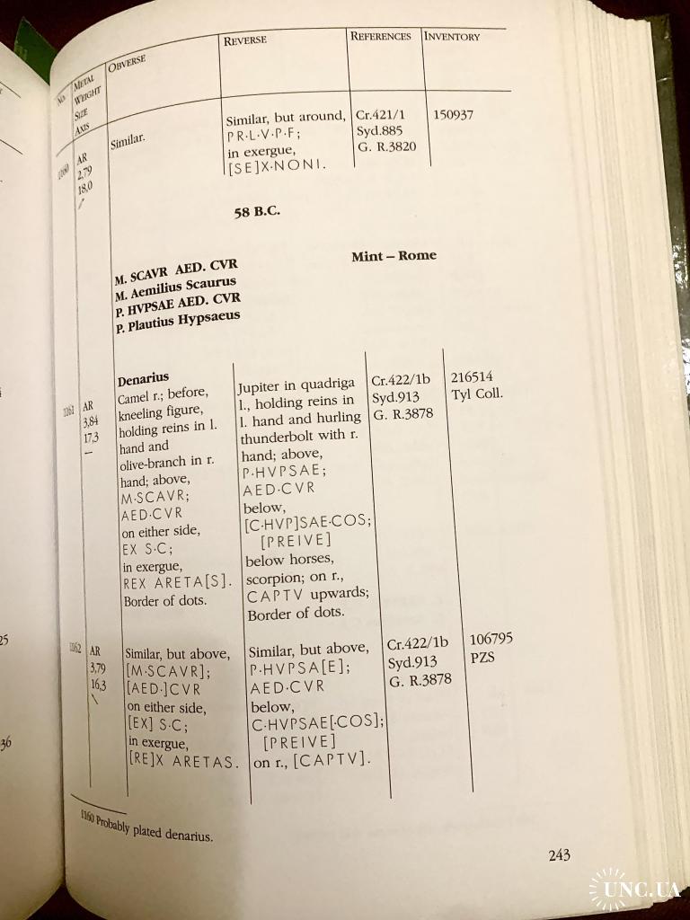 винятків . Усі дані, що ідентифікують конкретні монети, були включені щодо кожного випуску: ідентифікація монетного двору і номіналу, опис, метал, вага в грамах, діаметр у міліметрах і вісь. Також було надано інвентарні номери та посилання на найважливіші колекції, а також посилання на дослідження Кроуфорда і більш ранні роботи.
