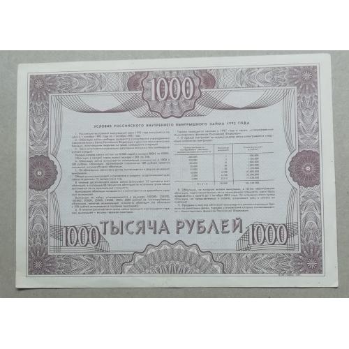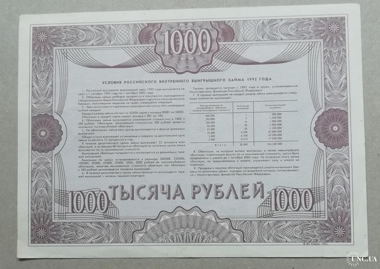 россия 1000 рублей 1992 год ГОСУДАРСТВЕННЫЙ внутренний ЗАЕМ ОБЛИГАЦИЯ россія 1000 рублів 1992