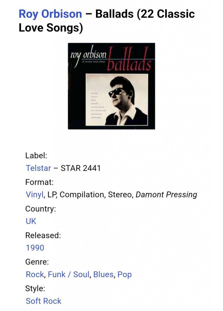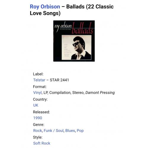 Вінілова платівка. Офіційна студійна збірка найкращих баллад, легендарного Американського музичного виконавця, одного з піонерів світового рок-н-ролу, володара титулів Греммі, зали слави рок-н-ролу, зірки Голлівудської алеї слави, пркійного вже, Роя Келтона Орбісона (Ballads. 22 Classic Love Songs) 1960-88. Випуск фірми (Telstar) England, 1990-ий рік. Оригінальне, першопресове Британське видання. Стан платівки ЕХ-/VG+. Конверт глянцевий. Стан конверту ЕХ. Відправка по Україні службами доставки: Нова Пошта, Укр Пошта, Делівері. Також відправляємо посилки за кордон по цілому світу.