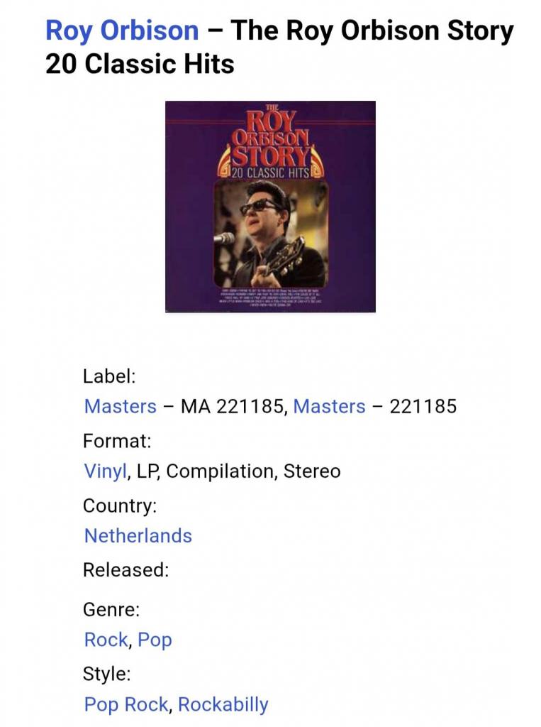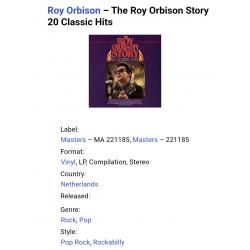 Вінілова платівка. Офіційна студійна збірка найкращих хітів, легендарного Американського музичного виконавця, одного з піонерів світового рок-н-ролу, володара титулів Греммі, зали слави рок-н-ролу, зірки Голлівудської алеї слави, пркійного вже, Роя Келтона Орбісона (The Roy Orbison Story. 20 Classic Hits) 1961-79. Випуск фірми (Masters) Holland, 1979-ий рік. Оригінальне, Нідерландське видання. Стан платівки ЕХ. Конверт глянцевий. Стан конверту ЕХ+. Відправка по Україні службами доставки: Нова Пошта, Укр Пошта, Делівері. Також відправляємо посилки за кордон по цілому світу.
