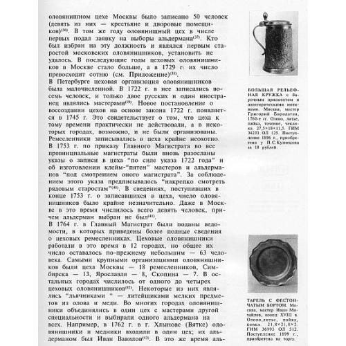 Авторы настоящего издания из всей проблематики оловянного производства выделили вопросы, связанные с деятельностью мастера-оловянишника: составили и охарактеризовали списки работ каждого ремесленника, выявили и воспроизвели клейма; собрали новые письменные данные о русских мастерах, попытались проанализировать весь массив русских клейм на олове XVIII в. как самостоятельный источник информации, приняв во внимание их графику, изобразительные мотивы, вариантность, повторения и многое другое.