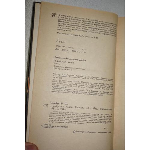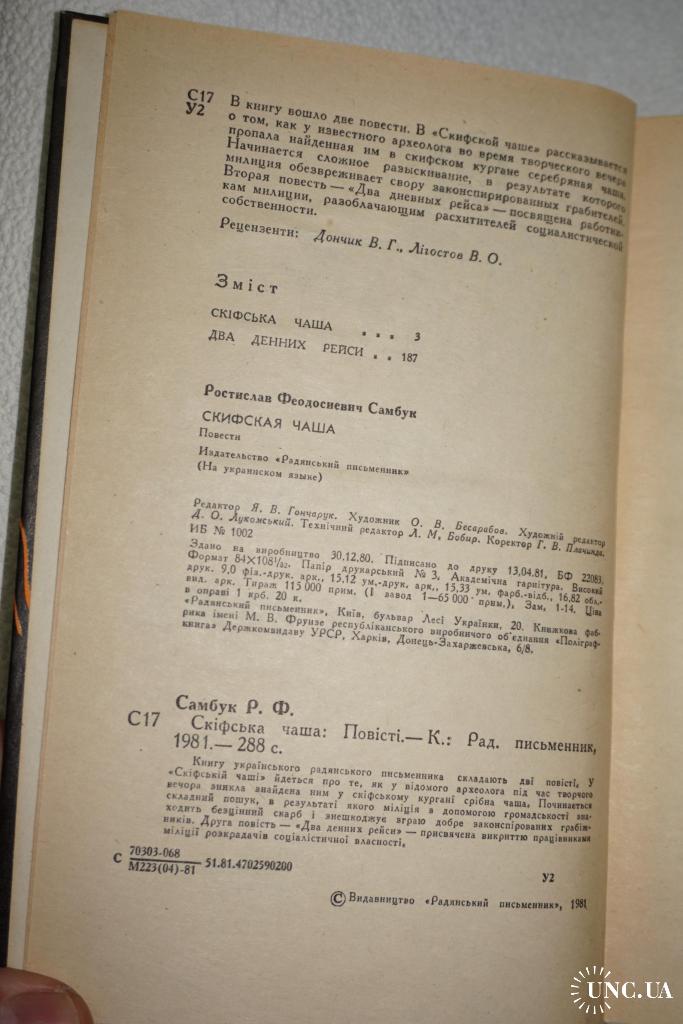 Книгу складають дві повісті. У Скіфській чаші йдеться про те, як у відомого археолога під час творчого вечора зникла знайдена ним у скіфському кургані срібна чаша. Починається складний пошук… Друга повість - Два денних рейси - присвячена викриттю праціваниками міліції розкрадачів соц. власності.