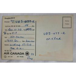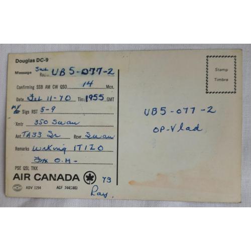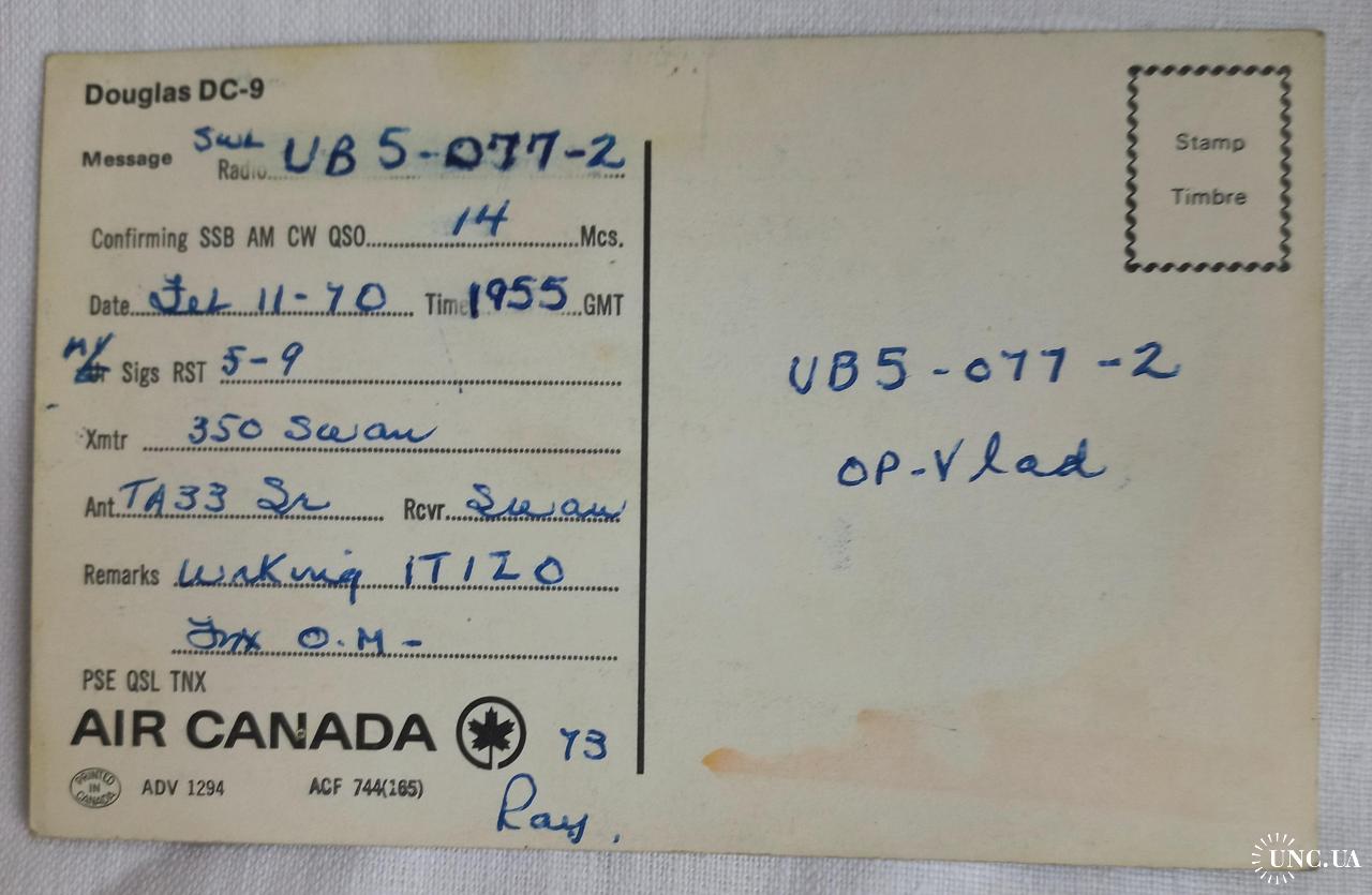 1961-1980Использован бланк почтовой открытки с изображением пассажирского самолета. Также на лицевой стороне размещен позывной сигнал радиолюбителя из Канады и его локация. На обратной стороне имеется логотип авиа компании»Эйр Канада» и данные радиообмена в эфире. Состояние карточки: малозаметные примятости уголков. Следы времени.