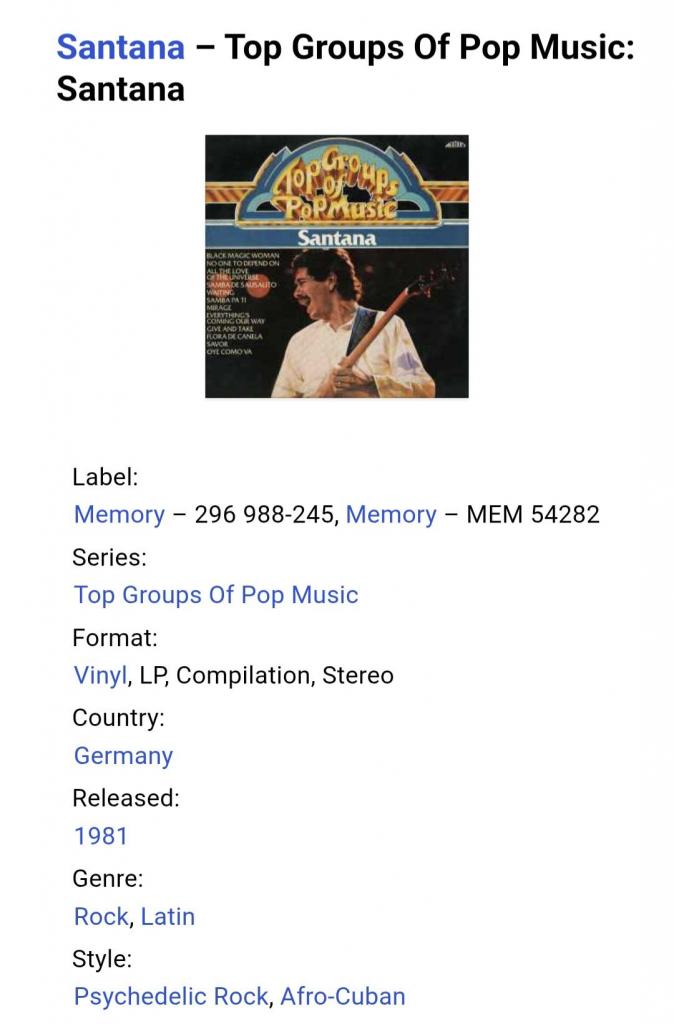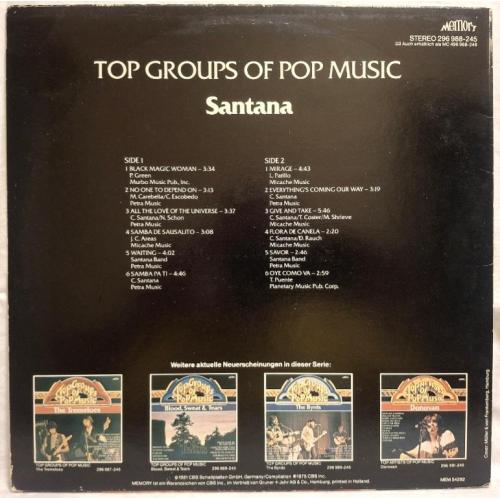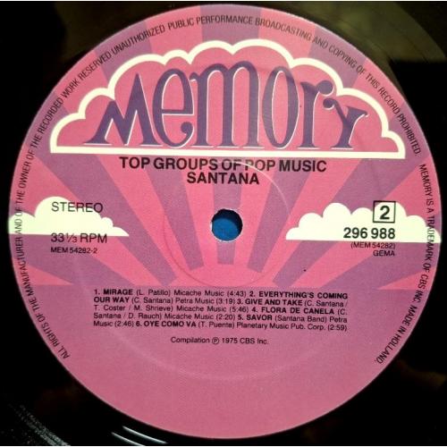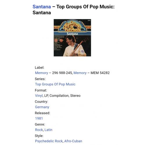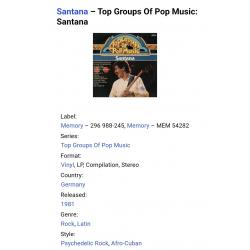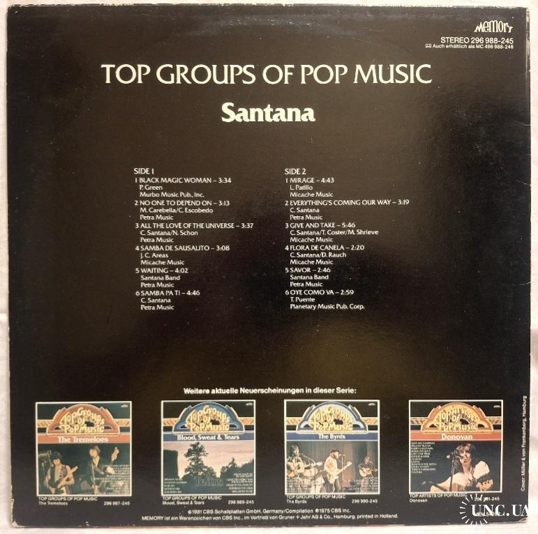 Вінілова платівка. Офіційна збірка найкращих хітів, Американського блюз-рок, джаз-рок, латін-рок виконавця Мекмиканського походження, володара титулів Австрійська музична нагорода Амадеус, Каліфорнійська зала слави, зірка Голлівудської алеї слави, Карлоса Сантани (Top Groups Of Pop Music) 1969-75. Випуск фірми (Memory) Germany, 1981-ий рік. Оригінальне Німецьке видання. Стан платівки EX+. Конверт глянцевий. Стан конверту EX-. Відправка по Україні службами доставки: Нова Пошта, Укр Пошта, Делівері. Також відправляємо посилки за кордон по цілому світу.
