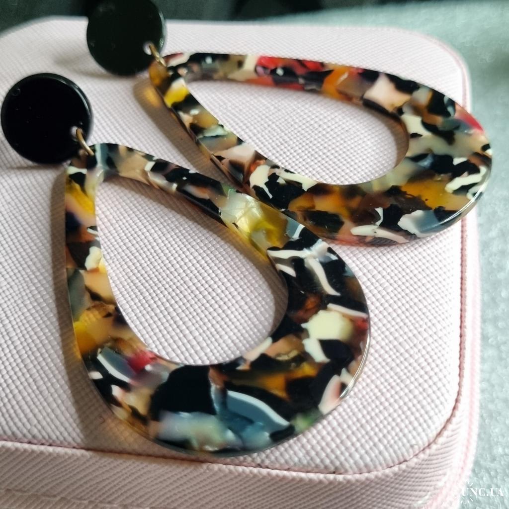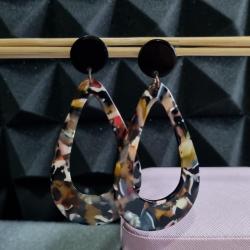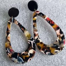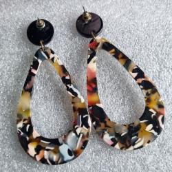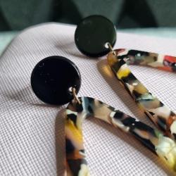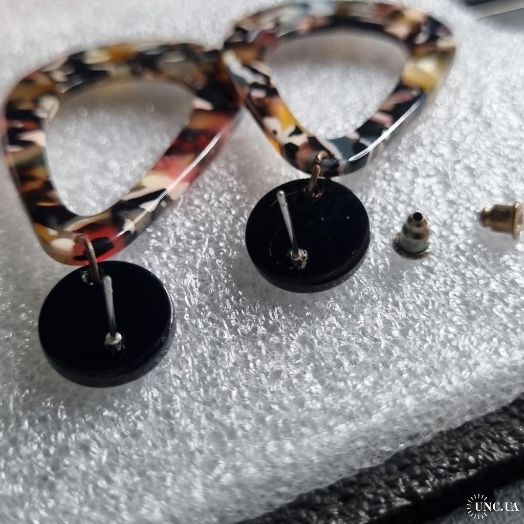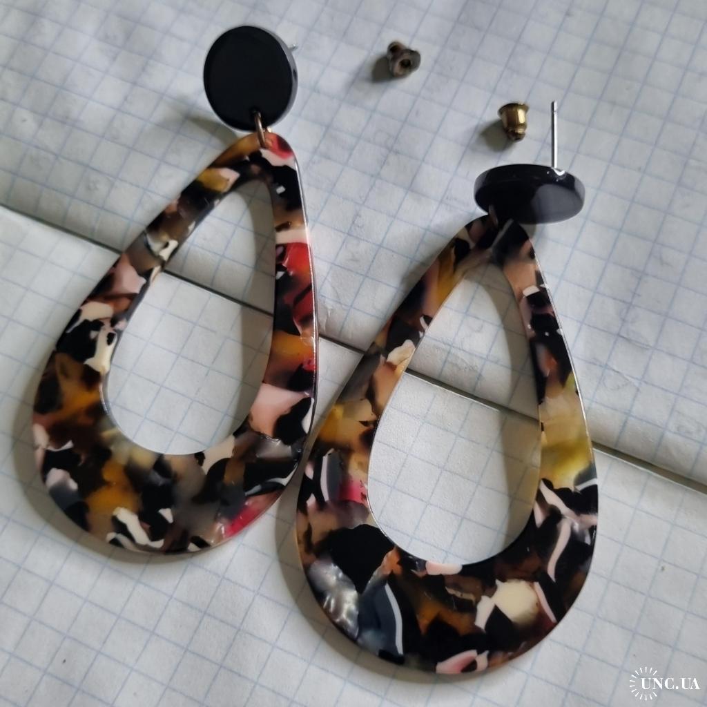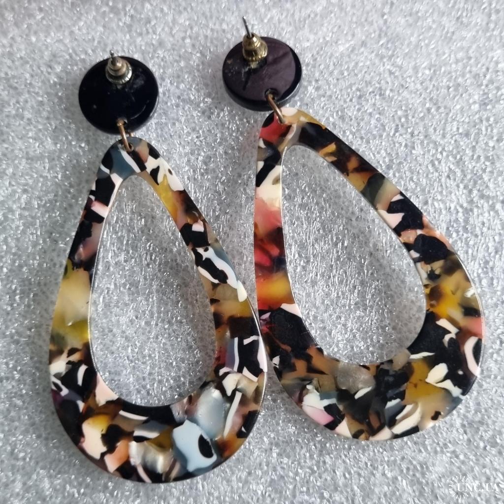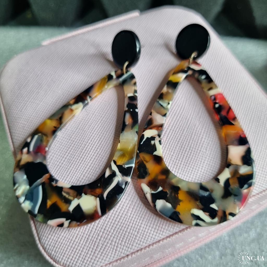 Верх — чорний круглий пусет діаметр 1,4 см, низ — краплеподібна або геометрична підвіска з мармуровим візерунком 6 см (жовтий, рожевий, білий, чорний, червоний).