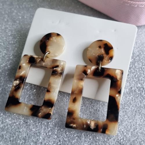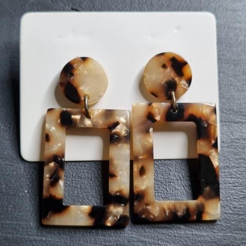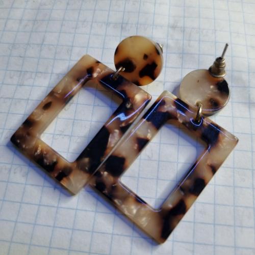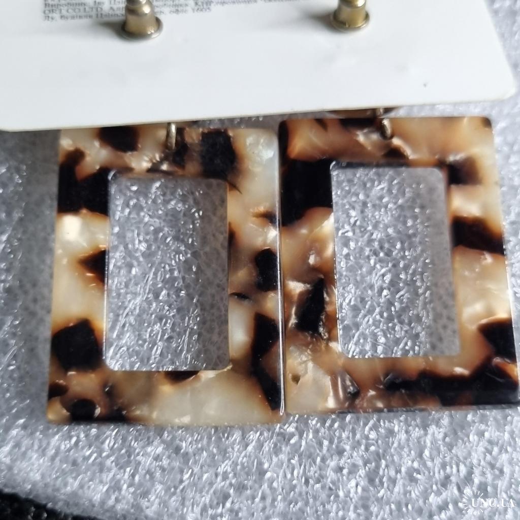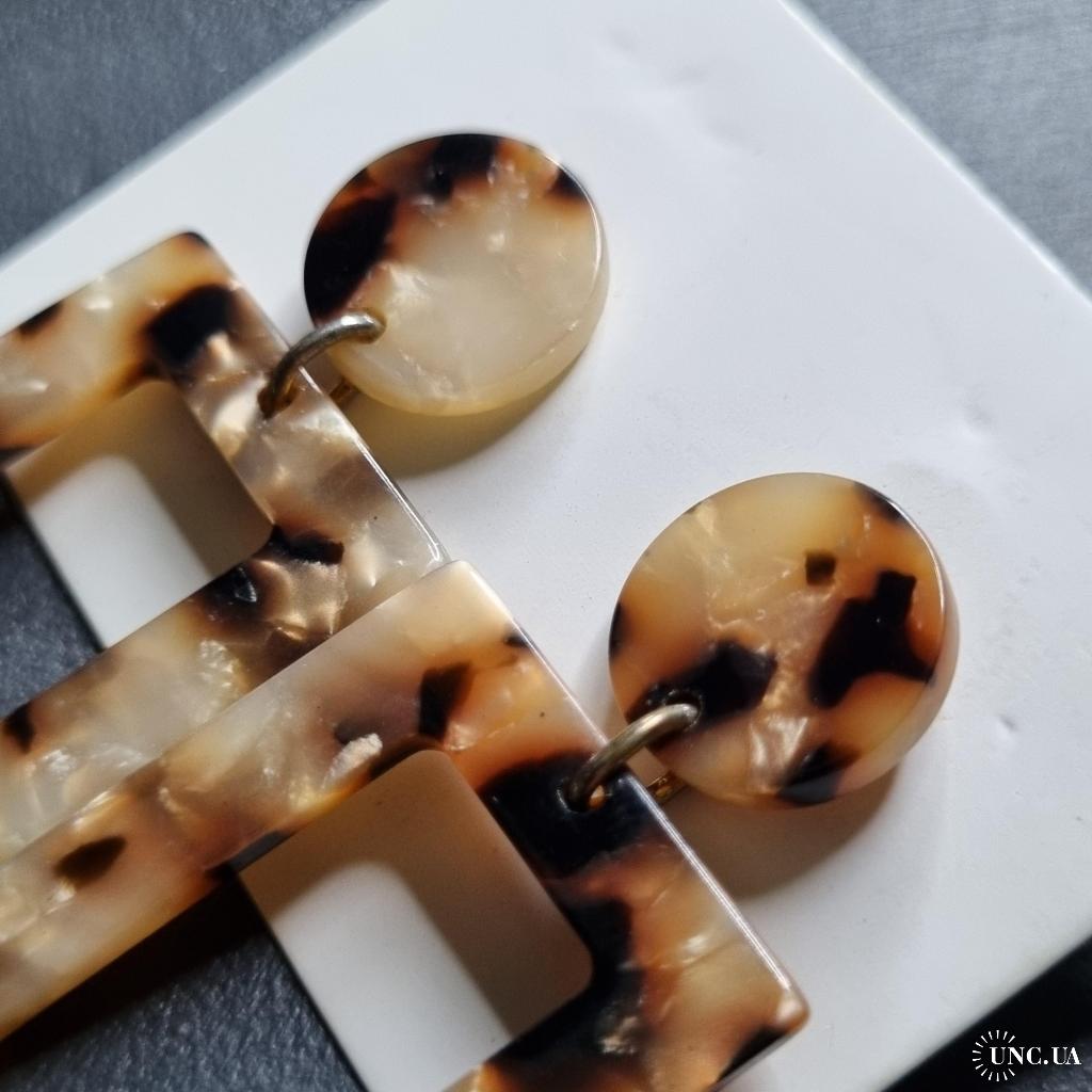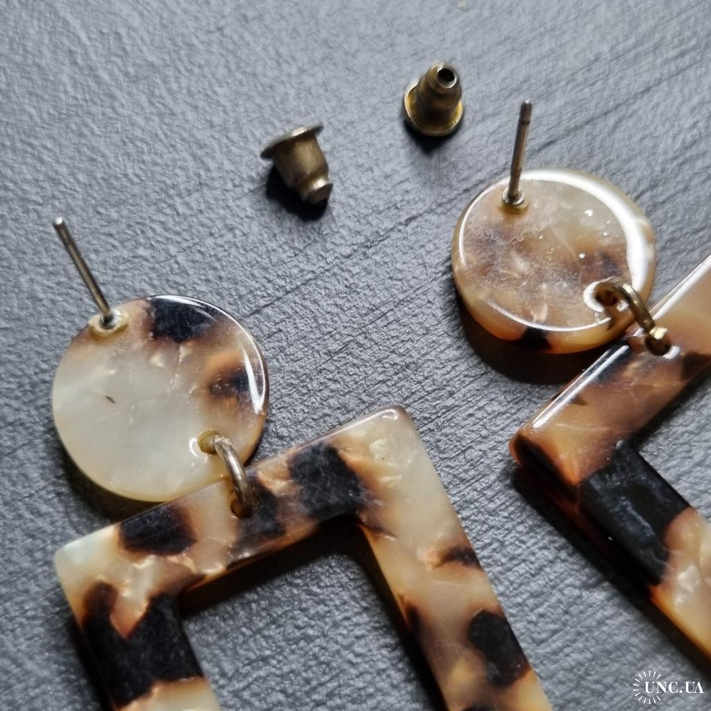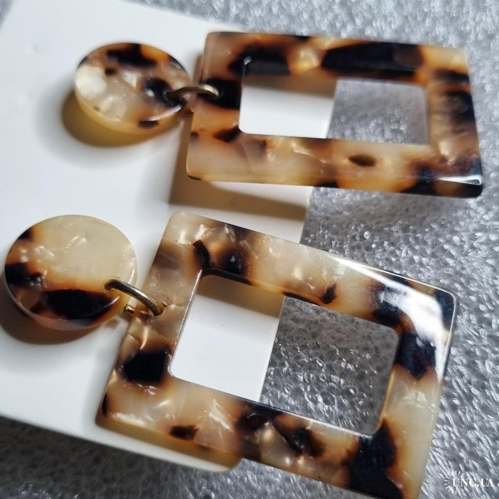 Сережки з акрилу з леопардовим візерунком у відтінках бежевого, коричневого та чорного. Складаються з круглої основи та прямокутного елемента з вирізом. Легкі, стильні, підкреслюють індивідуальність образу.