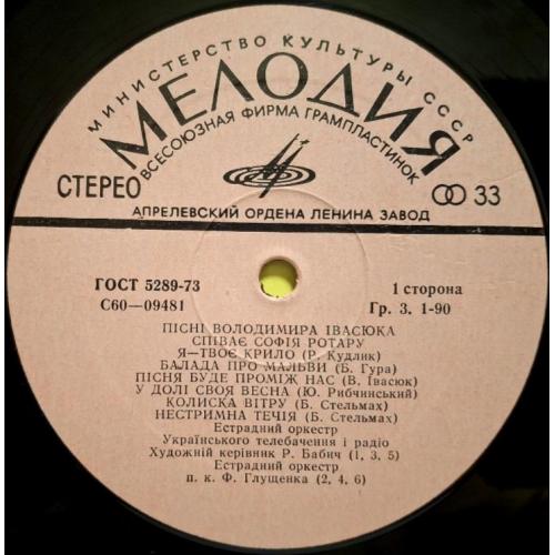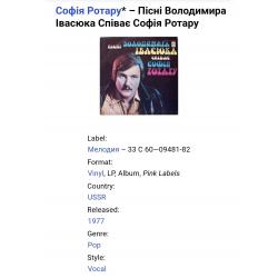 Вінілова платівка. П,ятий, в дискографії, студійний альбом Української (радянської) естрадної виконавиці з Чернівецької області, вокалістки вокально інструментального ансамблю Червона Рута, Народної Артистки України, Софії Михайлівни Ротару (Пісні Володимира Івасюка) 1977. Випуск фірми (Мелодія) СРСР, Апрелєвський завод грамплатівок, 1977-ий рік. Оригінальне, першопресове видання. Стан платівки ЕХ+. Стан конверту ЕХ+. Відправка по Україні службами доставки: Нова Пошта, Укр Пошта, Делівері. Також відправляємо посилки за кордон по цілому світу.