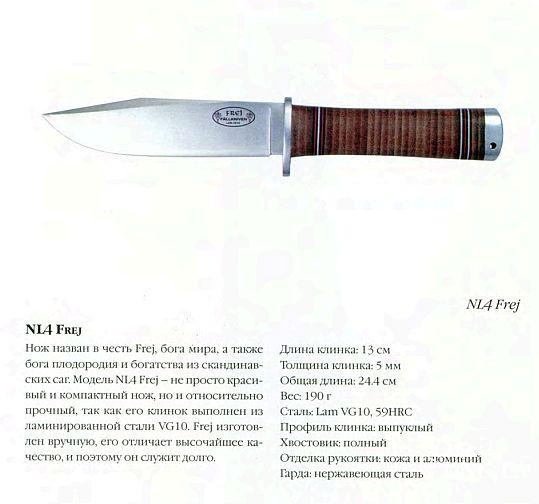 Каждый образец дан в иллюстрации, подробно описан и снабжен таблицей измерительных характеристик с указанием материалов, использованных при изготовлении клинка, рукоятки и ножен.