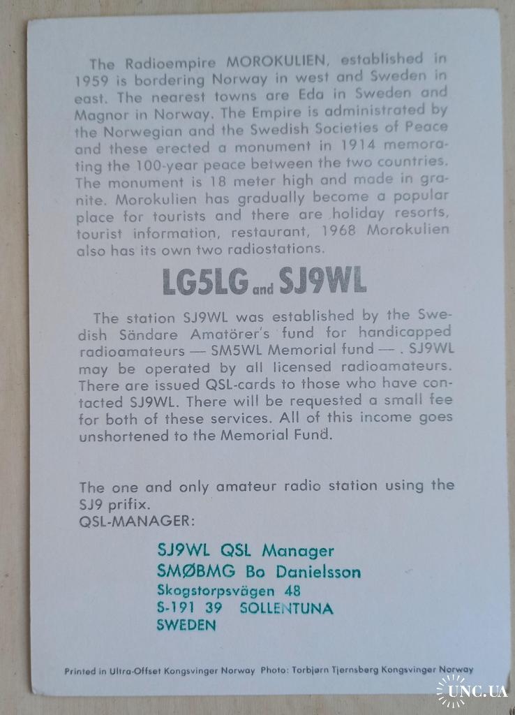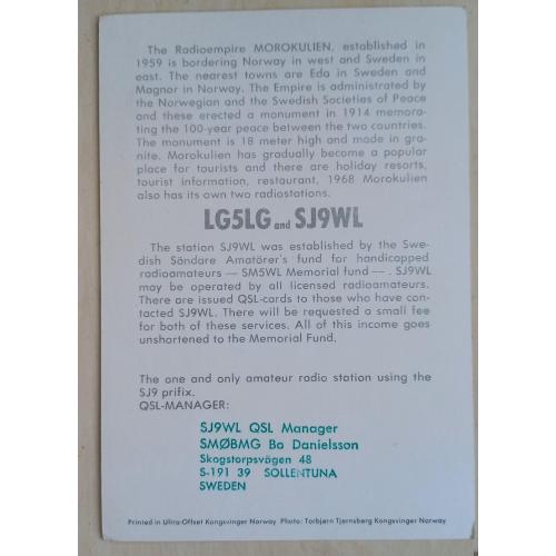 1961-1980На лицевой стороне фото местности и памятник из гранита , который возвелив 1914 г. в ознаменование 100-летнего мира между двумя странами.Ниже данные радиообмена. На обратной стороне краткое описание местности и любительской станции с уникальным позывным сигналом SJ9WL, созданной для поддержки радиолюбителей-инвалидов, с мемориальным фондом. Карточка напечатана ультра-офсетным способом в г. Конгвистер, Норвегия. Состояние карточки отличное.