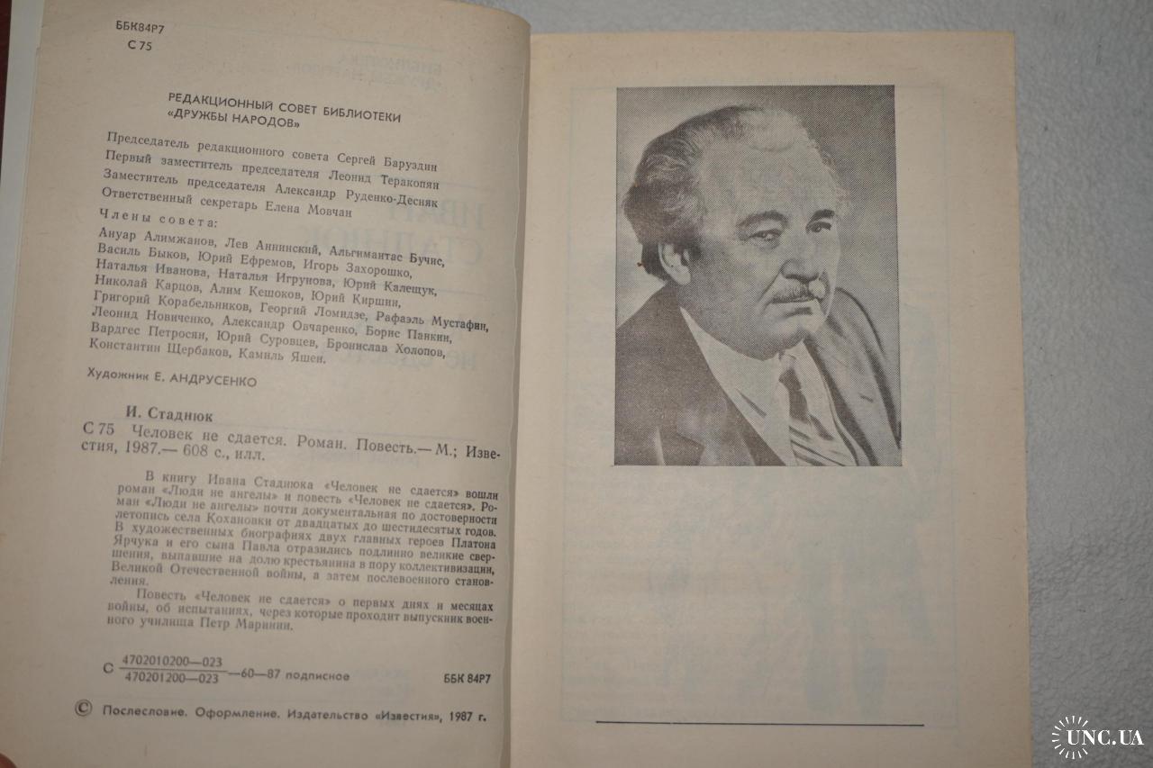 В книгу Ивана Стаднюка `Человек не сдается` вошли роман `Люди не ангелы` и повесть `Человек не сдается`. Роман `Люди не ангелы` почти документальная по достоверности летопись села Кохановки от двадцатых до шестидесятых годов.