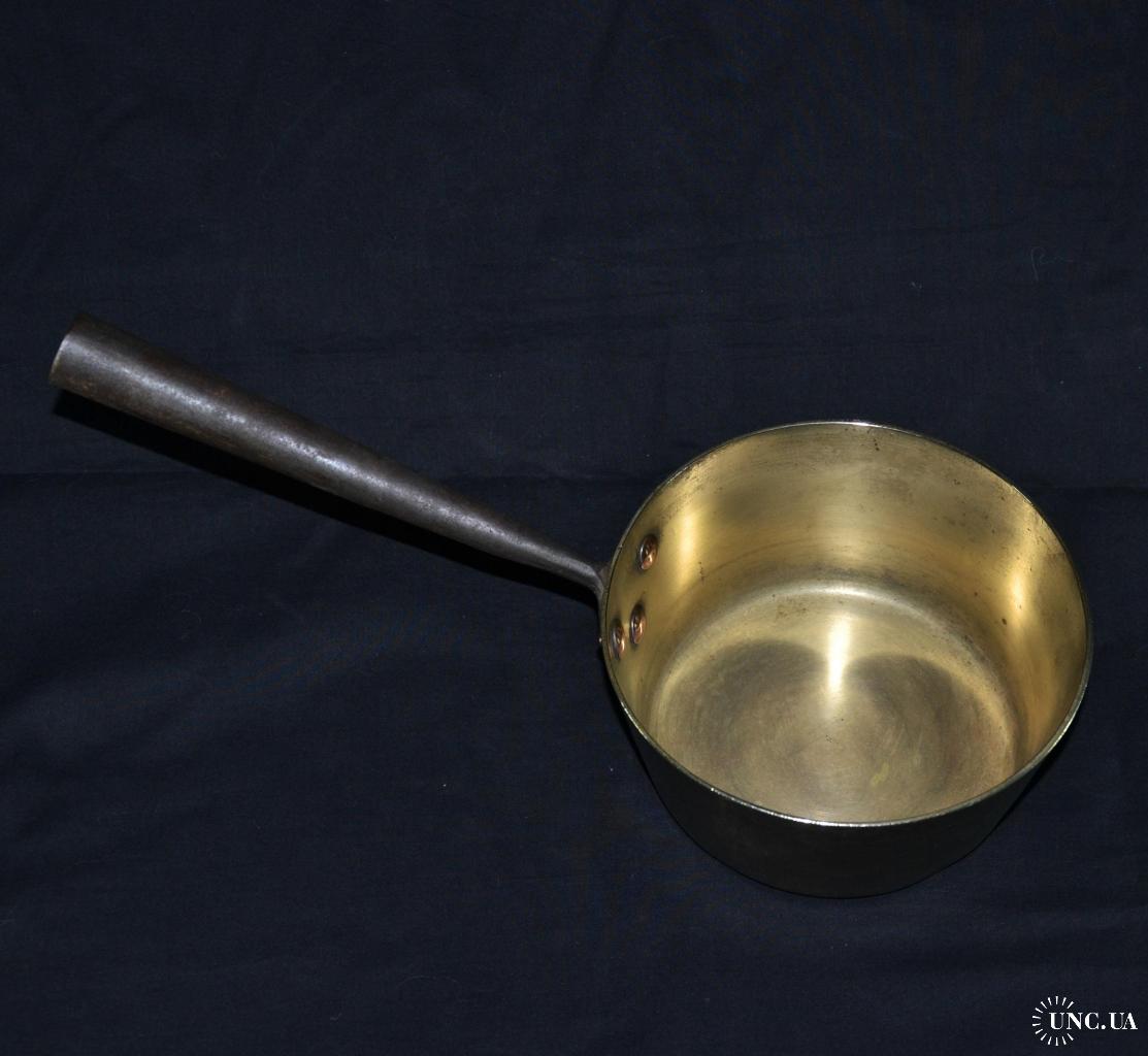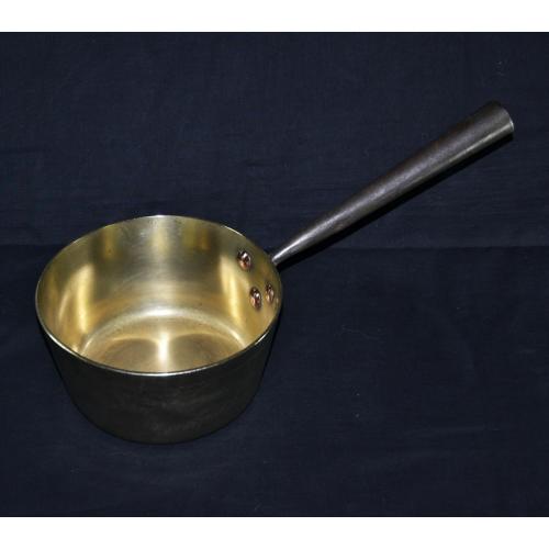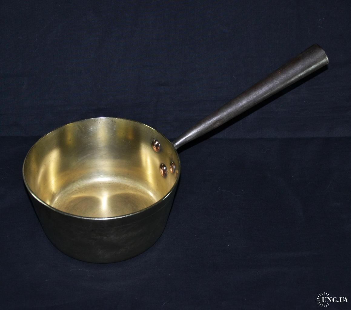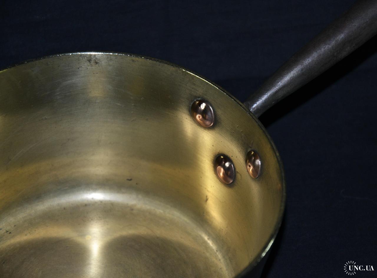 1901-1920Старинная латунная кастрюля или сотейник в деревенском стиле, с железной ручкой.