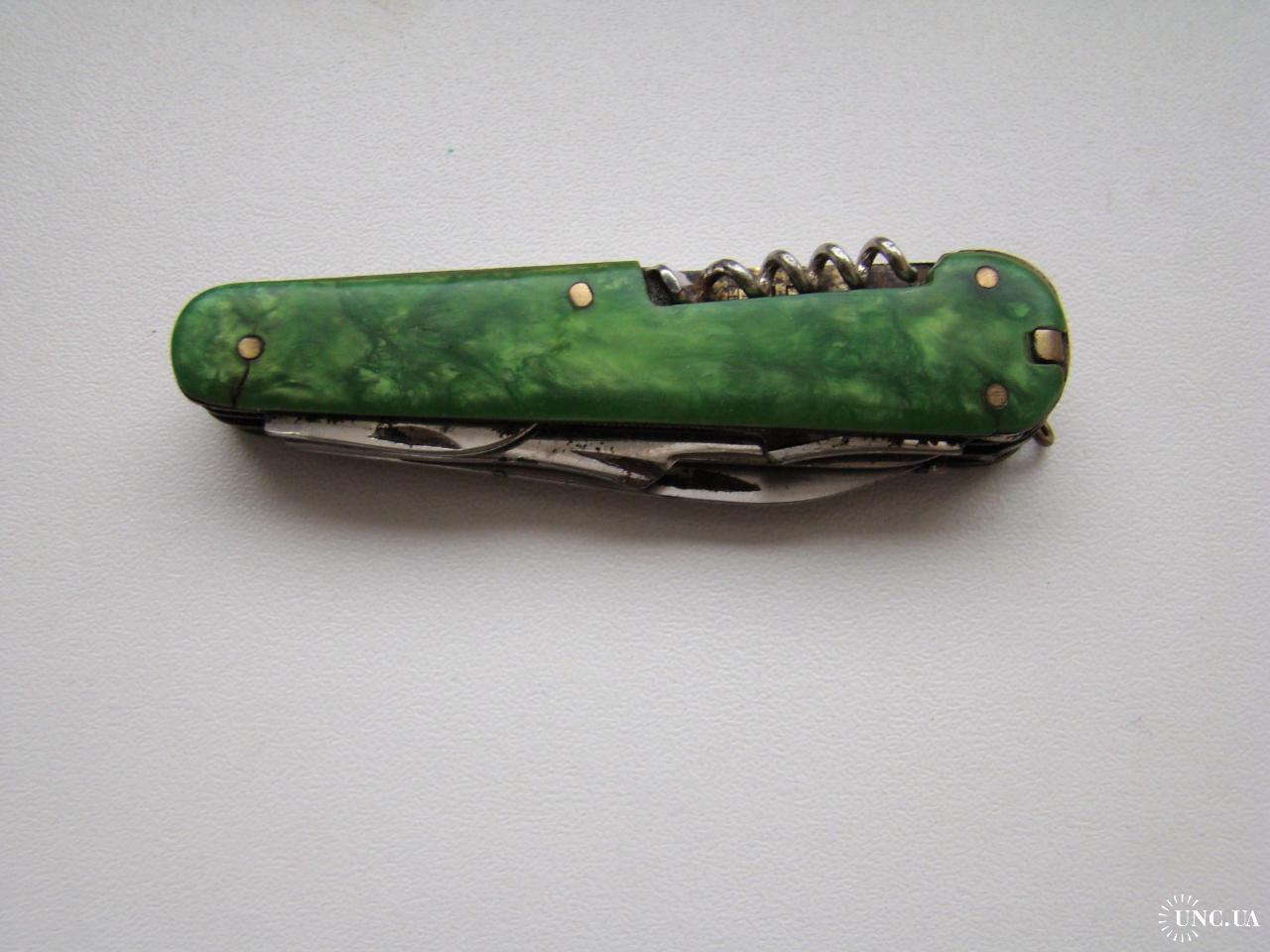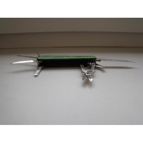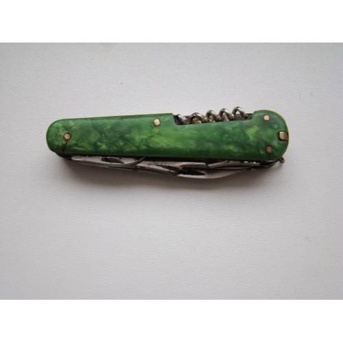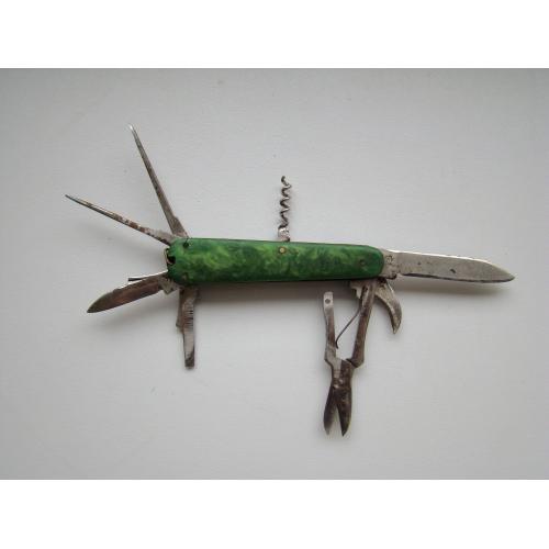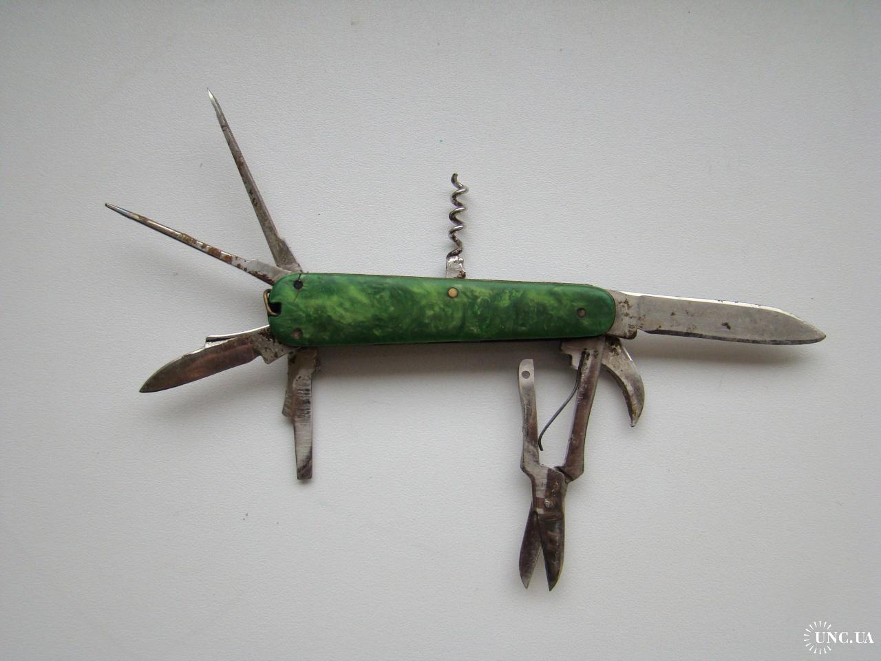 Нож, как по мне, в хорошем состоянии как для его лет. Пружины в норме, все 8 предметов не люфтят. Клеймо СН имеется на раме ножа, что означает, что данный нож был изготовлен в период с 1954 по 1975 гг. на Ворсменском заводе складных ножей г.Ворсма. В остальном все как на фото. В коллекцию.