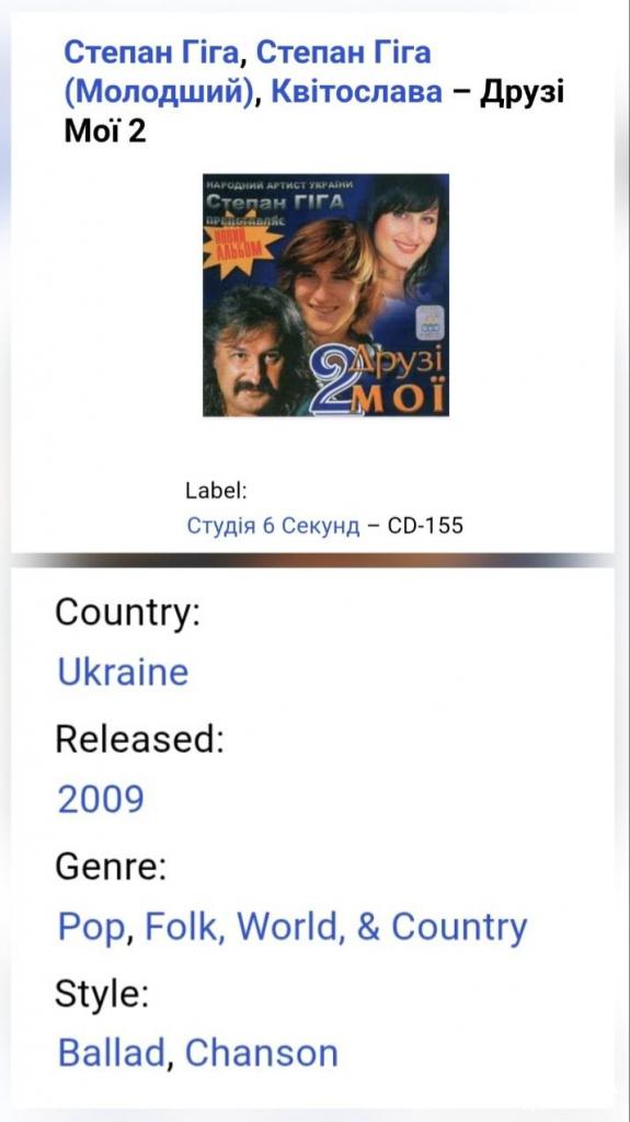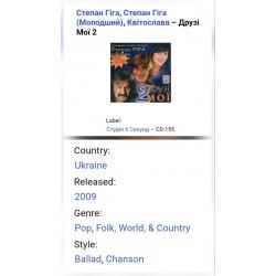 Аудіо касета. Студійний запис. П'ятий, в дискографії, студійний альбом, Українського, Народного та Заслуженого артиста України, володара титулів Ордена Князя Костянтина Острозького 1-го ступеня, Ордена Козацька Слава 3-го ступеня, Орденів Андрія Первозванного 1-го та 2-го ступенів, Ордена Різдва Христового, відзнакою Золотий Диск в Мюнхені, покійного вже Степана Петровича Гіги (Друзі Мої-2) 2009. Випуск фірми (6 Секунд) Ukraine. 2009-ий рік. Ліцензія. Акциз А 006953 ГЄ. Стан новий. Запакована в рідну захисну плівку. Відправка по Україні службами доставки: Нова Пошта, Укр Пошта, Делівері. Також відправляємо посилки за кордон по цілому світу.