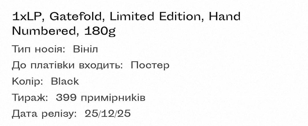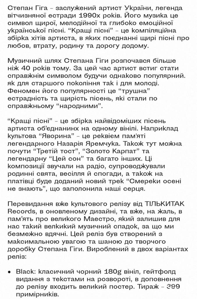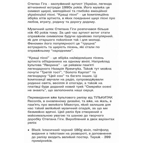 Вінілова платівка. Оновлена, офіційна збірка найкращих хітів з додатковим треком, Українського, Народного та Заслуженого артиста України, володара титулів Ордена Князя Костянтина Острозького 1-го ступеня, Ордена Козацька Слава 3-го ступеня, Орденів Андрія Первозванного 1-го та 2-го ступенів, Ордена Різдва Христового, відзнакою Золотий Диск в Мюнхені, покійного вже Степана Петровича Гіги (Кращі Пісні) 1995-2014. Випуск фірми (Тільки Так Records) Ukraine, 2025-ий рік. Лімітований тираж (Limited Edition) 399 копій. Прономерований вручну тираж. Кожне видання під власним окремим номером. В комплекті великий постер. Видання нове, запаковане. Категорія S/S. Відправка по Україні службами доставки: Нова Пошта, Укр Пошта, Делівері. Також відправляємо посилки за кордон по цілому світу.